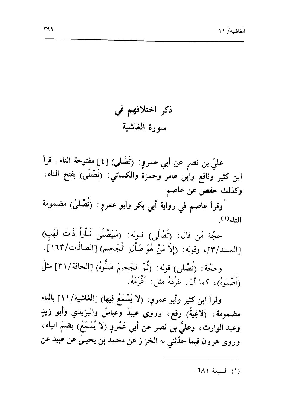 عليّ بن نصر عن أبي عمرو: تصلى [4] مفتوحة التاء. قرأ ابن كثير ونافع وابن عامر وحمزة والكسائي تصلى بفتح التاء، وكذلك حفص عن عاصم.