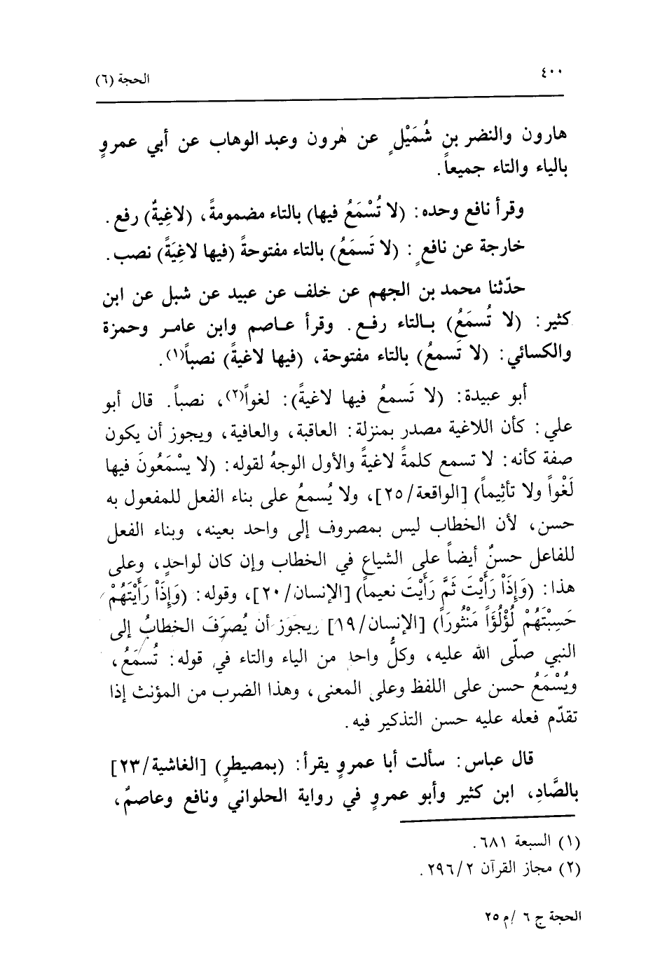 حدّثنا محمد بن الجهم عن خلف عن عبيد عن شبل عن ابن كثير: لا تسمع* بالتاء رفع. وقرأ عاصم وابن عامر وحمزة والكسائي: لا تسمع بالتاء مفتوحة، فيها لاغية نصبا «1».