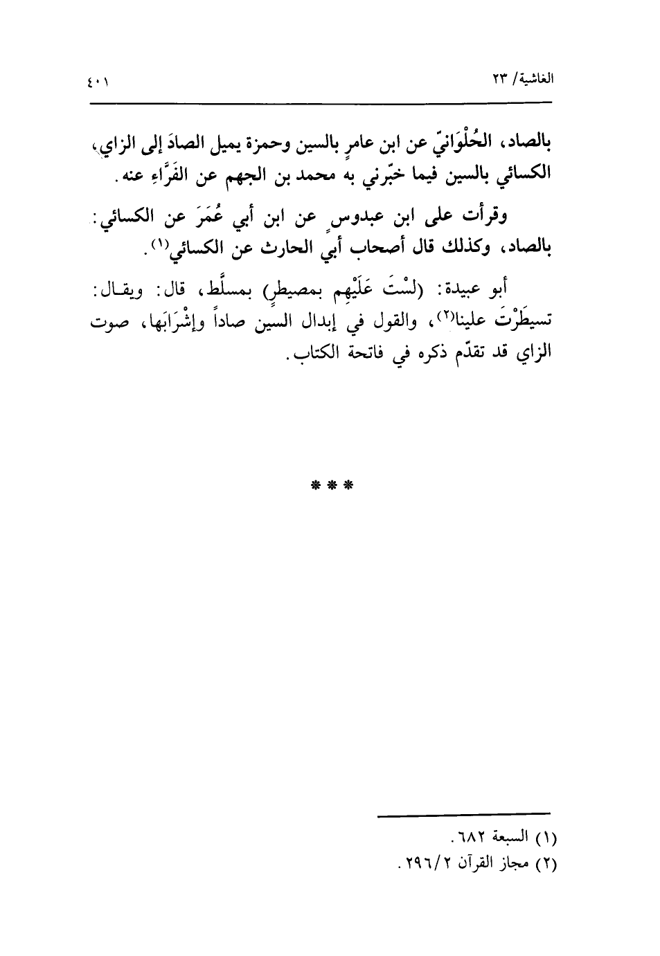 تسيطرت علينا «2»، والقول في إبدال السين صادا وإشرابها، صوت الزاي قد تقدم ذكره في فاتحة الكتاب.