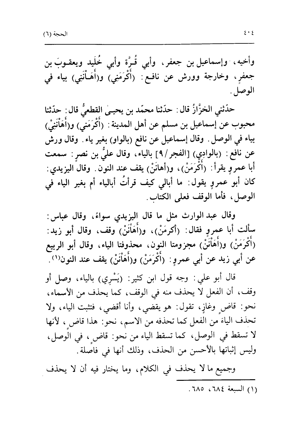 حدّثني الخزّاز قال: حدّثنا محمّد بن يحيى القطعيّ قال: حدّثنا محبوب عن إسماعيل بن مسلم عن أهل المدينة: أكرمني وأهانني بياء في الوصل. وقال إسماعيل عن نافع بالواو بغير ياء. وقال ورش عن نافع: بالوادي [الفجر/ 9] بالياء، وقال عليّ بن نصر: سمعت أبا عمرو يقرأ: أكرمن، وأهانن يقف عند النون. وقال اليزيدي: