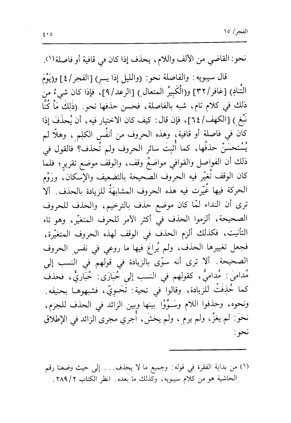 (1) من بداية الفقرة في قوله: وجميع ما لا يحذف ... إلى حيث وضعنا رقم الحاشية هو من كلام سيبويه، وكذلك ما بعده. انظر الكتاب 2/ 289.