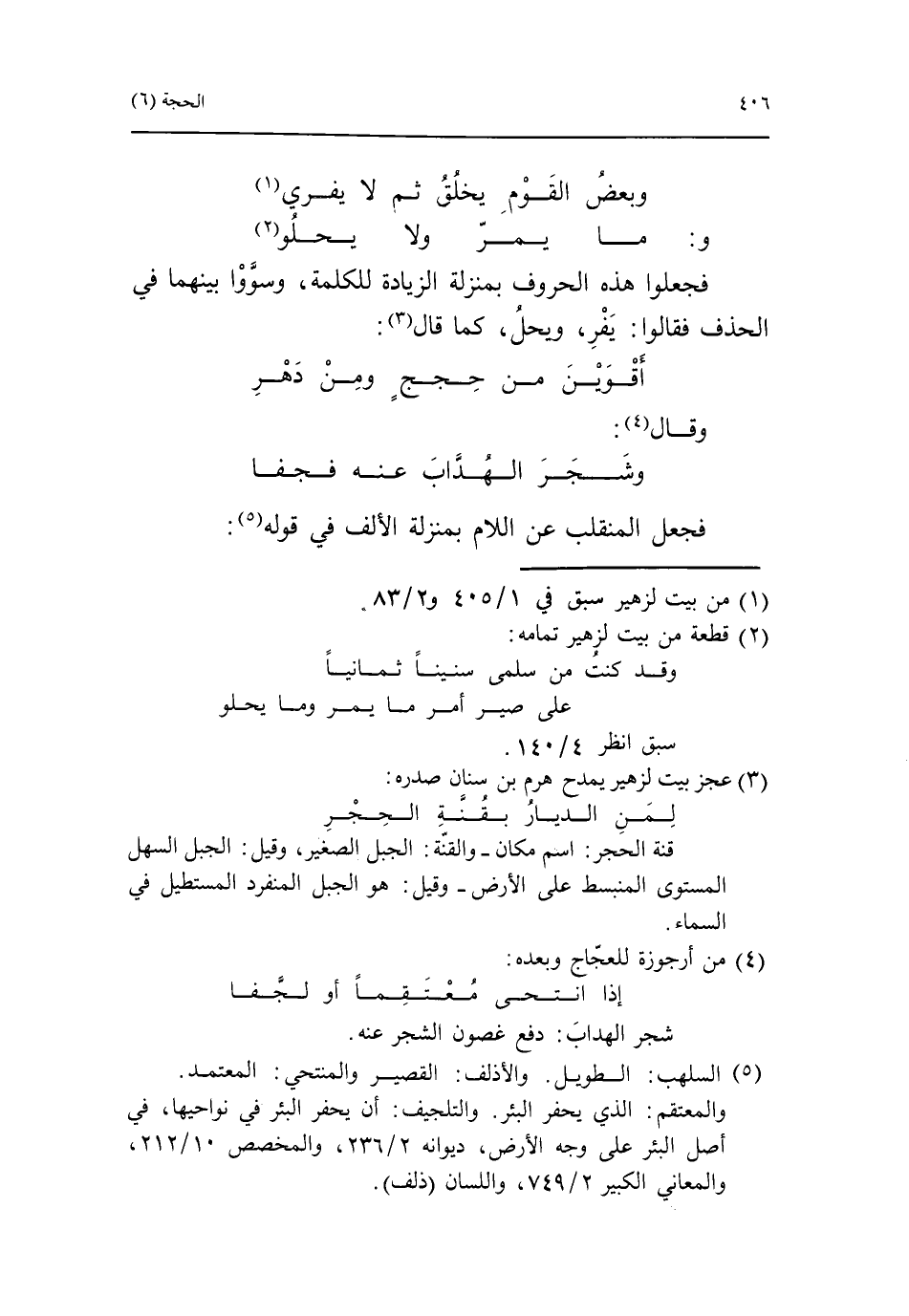 وبعض القوم يخلق ثم لا يفري «1» و: ما يمرّ ولا يحلو «2» فجعلوا هذه الحروف بمنزلة الزيادة للكلمة، وسوّوا بينهما في الحذف فقالوا: يفر، ويحل، كما قال «3»: