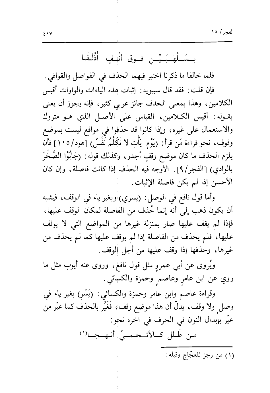 وقراءة عاصم وابن عامر وحمزة والكسائي: يسر بغير ياء في وصل ولا وقف، يدلّ أن هذا موضع وقف، فغيّر بالحذف كما غيّر من غيّر بإبدال النون في الحرف في آخره نحو:
