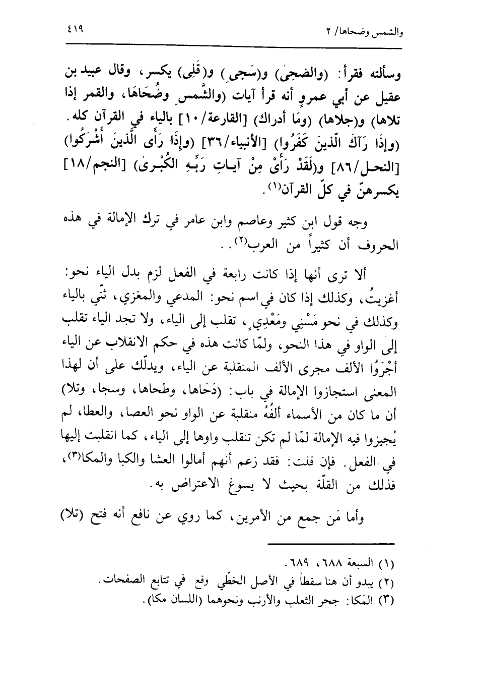 وسألته فقرأ: والضحى وسجى وقلى يكسر، وقال عبيد بن عقيل عن أبي عمرو أنه قرأ آيات والشمس وضحاها، والقمر إذا تلاها وجلاها وما أدراك [القارعة/ 10] بالياء في القرآن كله.