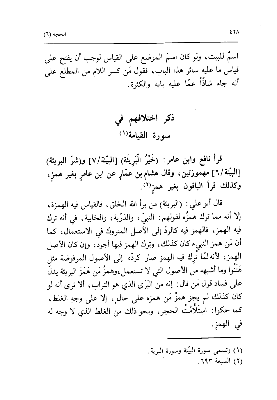 قرأ نافع وابن عامر: خير البريئة [البيّنة/ 7] وشر البريئة [البيّنة/ 6] مهموزتين، وقال هشام بن عمّار عن ابن عامر بغير همز، وكذلك قرأ الباقون بغير همز «2».