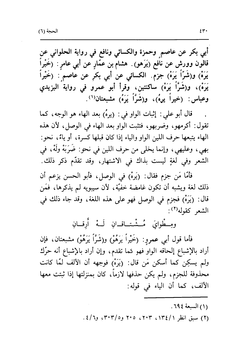 أبي بكر عن عاصم وحمزة والكسائي ونافع في رواية الحلواني عن قالون وورش عن نافع يرهو*. هشام بن عمّار عن أبي عامر: خيرا يره وشرا يره جزم. الكسائي عن أبي بكر عن عاصم: خيرا يره، وشرا يره ساكنتين، وقرأ أبو عمرو في رواية اليزيدي وعباس: خيرا يره، وشرا يره مشبعتان «1».