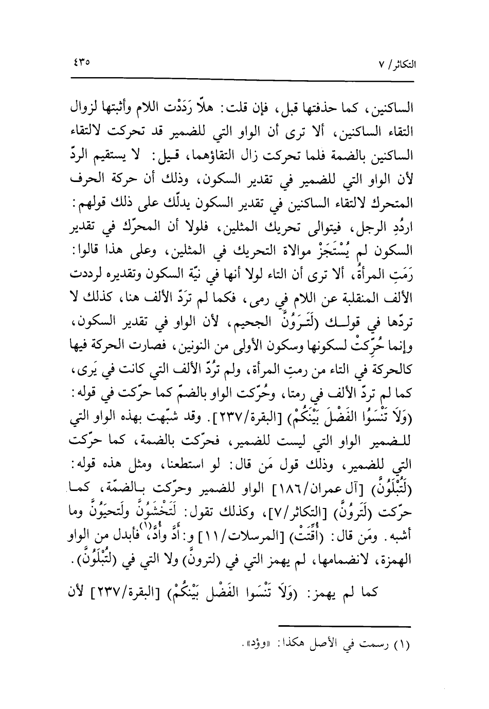 رمت المرأة، ألا ترى أن التاء لولا أنها في نيّة السكون وتقديره لرددت الألف المنقلبة عن اللام في رمى، فكما لم تردّ الألف هنا، كذلك لا تردّها في قولك لترون الجحيم، لأن الواو في تقدير السكون، وإنما حرّكت لسكونها وسكون الأولى من النونين، فصارت الحركة فيها كالحركة في التاء من رمت المرأة، ولم تردّ الألف التي كانت في يرى، كما لم تردّ الألف في رمتا، وحرّكت الواو بالضمّ كما حرّكت في قوله: