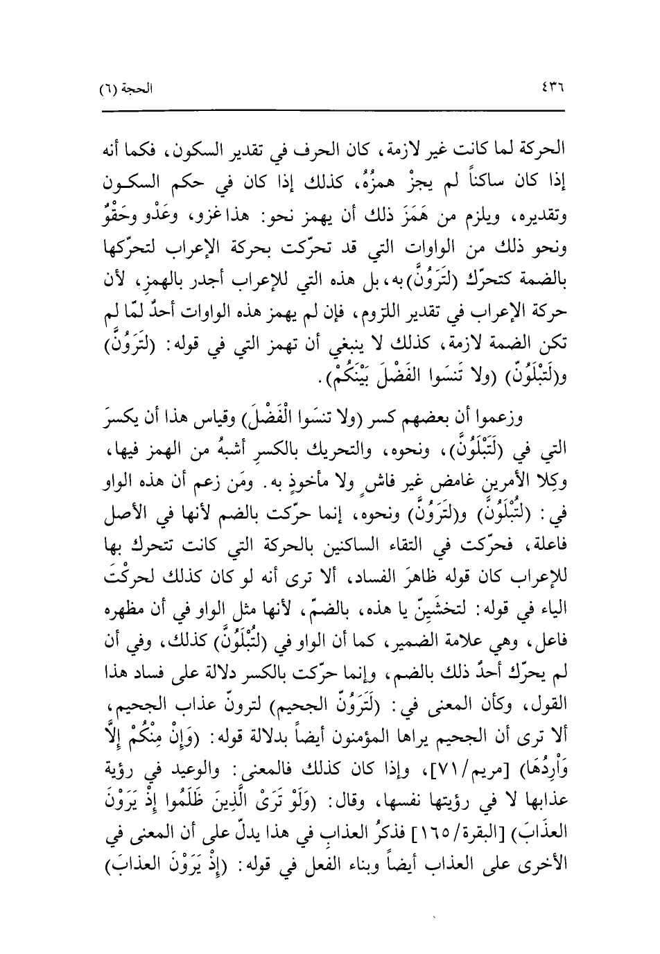الحركة لما كانت غير لازمة، كان الحرف في تقدير السكون، فكما أنه إذا كان ساكنا لم يجز همزه، كذلك إذا كان في حكم السكون وتقديره، ويلزم من همز ذلك أن يهمز نحو: هذا غزو، وعدو وحقو ونحو ذلك من الواوات التي قد تحرّكت بحركة الإعراب لتحرّكها بالضمة كتحرّك لترون به، بل هذه التي للإعراب أجدر بالهمز، لأن حركة الإعراب في تقدير اللزوم، فإن لم يهمز هذه الواوات أحد لمّا لم تكن الضمة لازمة، كذلك لا ينبغي أن تهمز التي في قوله: لترون ولتبلون ولا تنسوا الفضل بينكم.