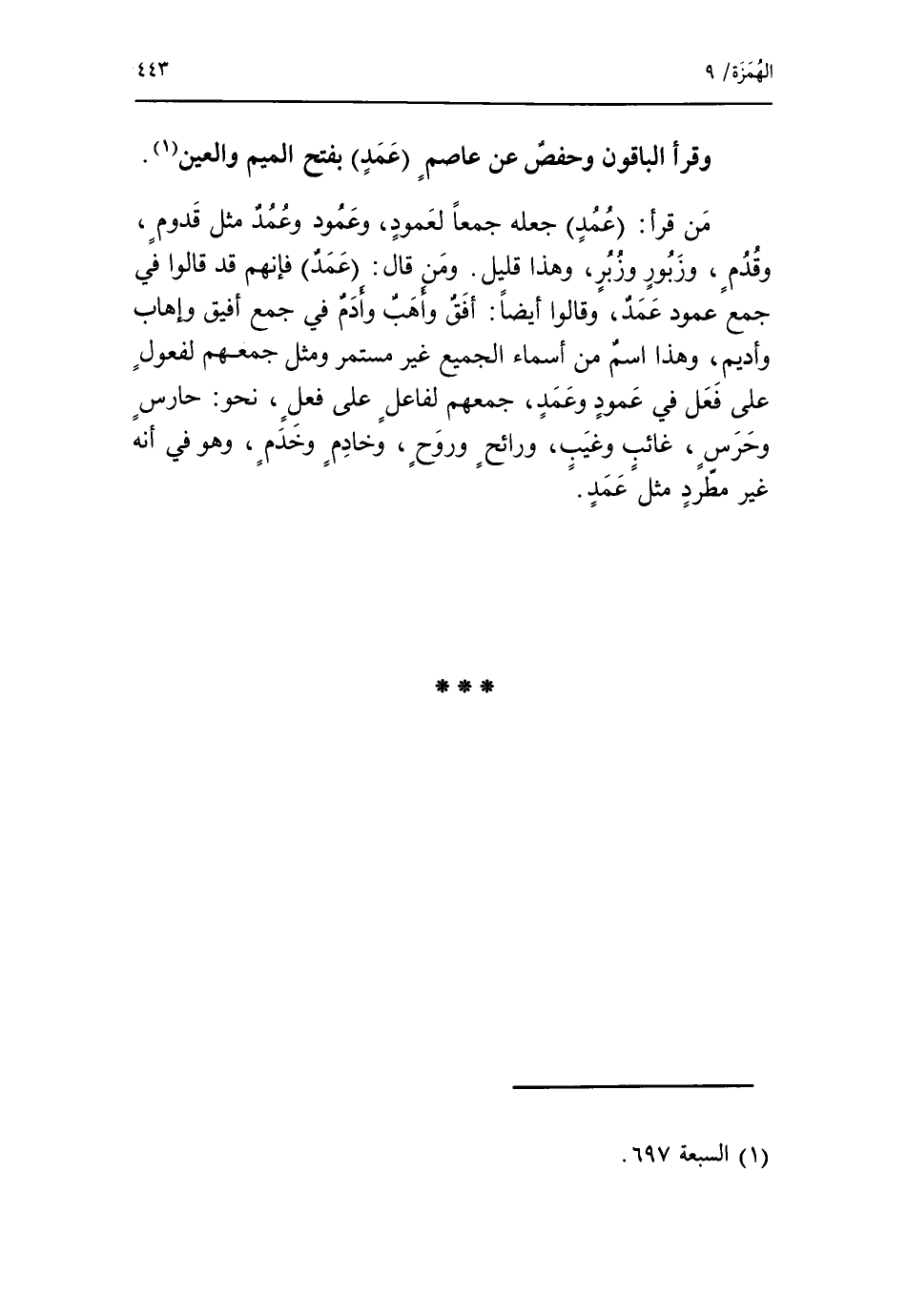 من قرأ: عمد* جعله جمعا لعمود، وعمود وعمد مثل قدوم، وقدم، وزبور وزبر، وهذا قليل. ومن قال: عمد* فإنهم قد قالوا في جمع عمود عمد، وقالوا أيضا: أفق وأهب وأدم في جمع أفيق وإهاب وأديم، وهذا اسم من أسماء الجميع غير مستمر ومثل جمعهم لفعول على فعل في عمود وعمد، جمعهم لفاعل على فعل، نحو: حارس وحرس، غائب وغيب، ورائح وروح، وخادم وخدم، وهو في أنه غير مطّرد مثل عمد.