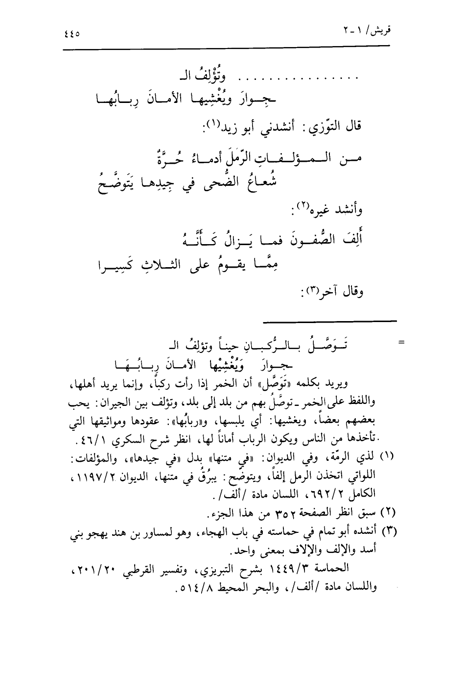 توصّل بالرّكبان حينا وتؤلف الجوار ويغشيها الأمان ربابها ويريد بكلمة «توصّل» أن الخمر إذا رأت ركبا، وإنما يريد أهلها، واللفظ على الخمر- توصّل بهم من بلد إلى بلد، وتؤلف بين الجيران: يحب بعضهم بعضا، ويغشيها: أي يلبسها، و «ربابها»: عقودها ومواثيقها التي تأخذها من الناس ويكون الرباب أمانا لها، انظر شرح السكري 1/ 46.