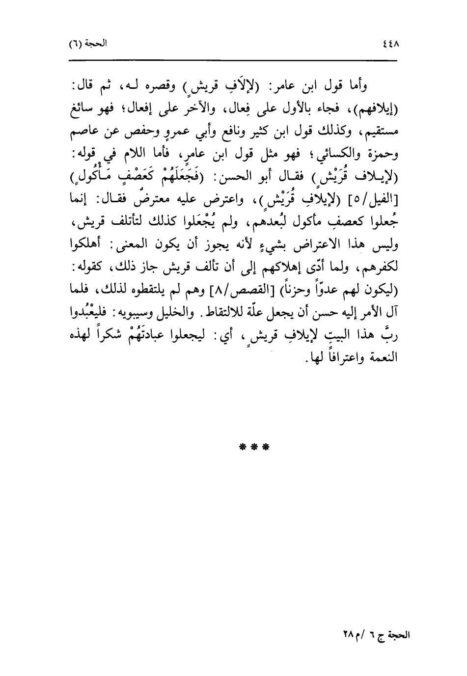 لإيلاف قريش فقال أبو الحسن: فجعلهم كعصف مأكول [الفيل/ 5] لإيلاف قريش، واعترض عليه معترض فقال: إنما جعلوا كعصف مأكول لبعدهم، ولم يجعلوا كذلك لتأتلف قريش، وليس هذا الاعتراض بشيء لأنه يجوز أن يكون المعنى: أهلكوا لكفرهم، ولما أدّى إهلاكهم إلى أن تألف قريش جاز ذلك، كقوله: