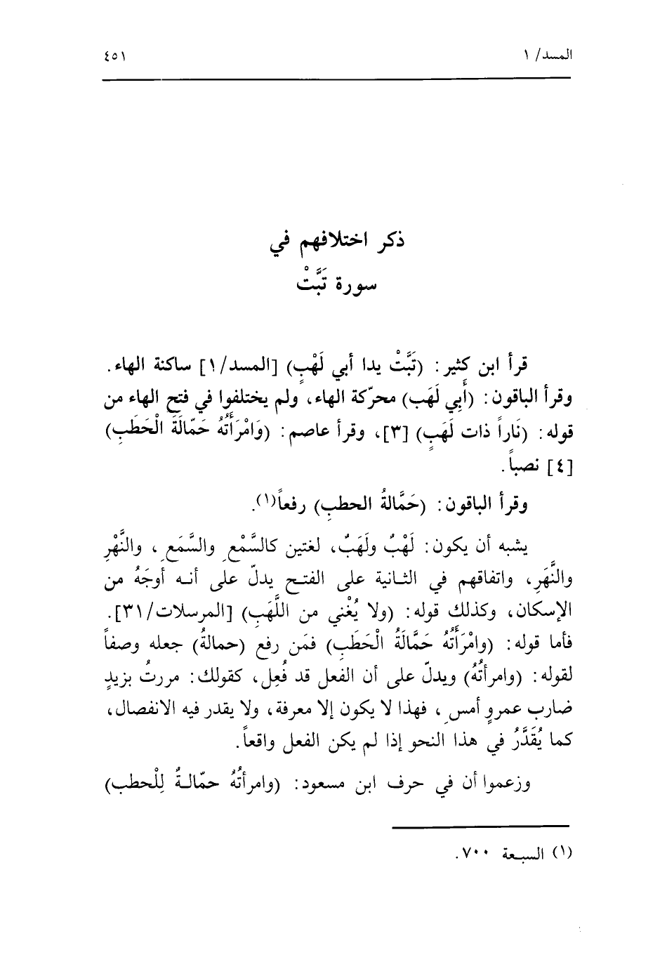 وقرأ الباقون: أبي لهب محرّكة الهاء، ولم يختلفوا في فتح الهاء من قوله: نارا ذات لهب [3]، وقرأ عاصم: وامرأته حمالة الحطب [4] نصبا.