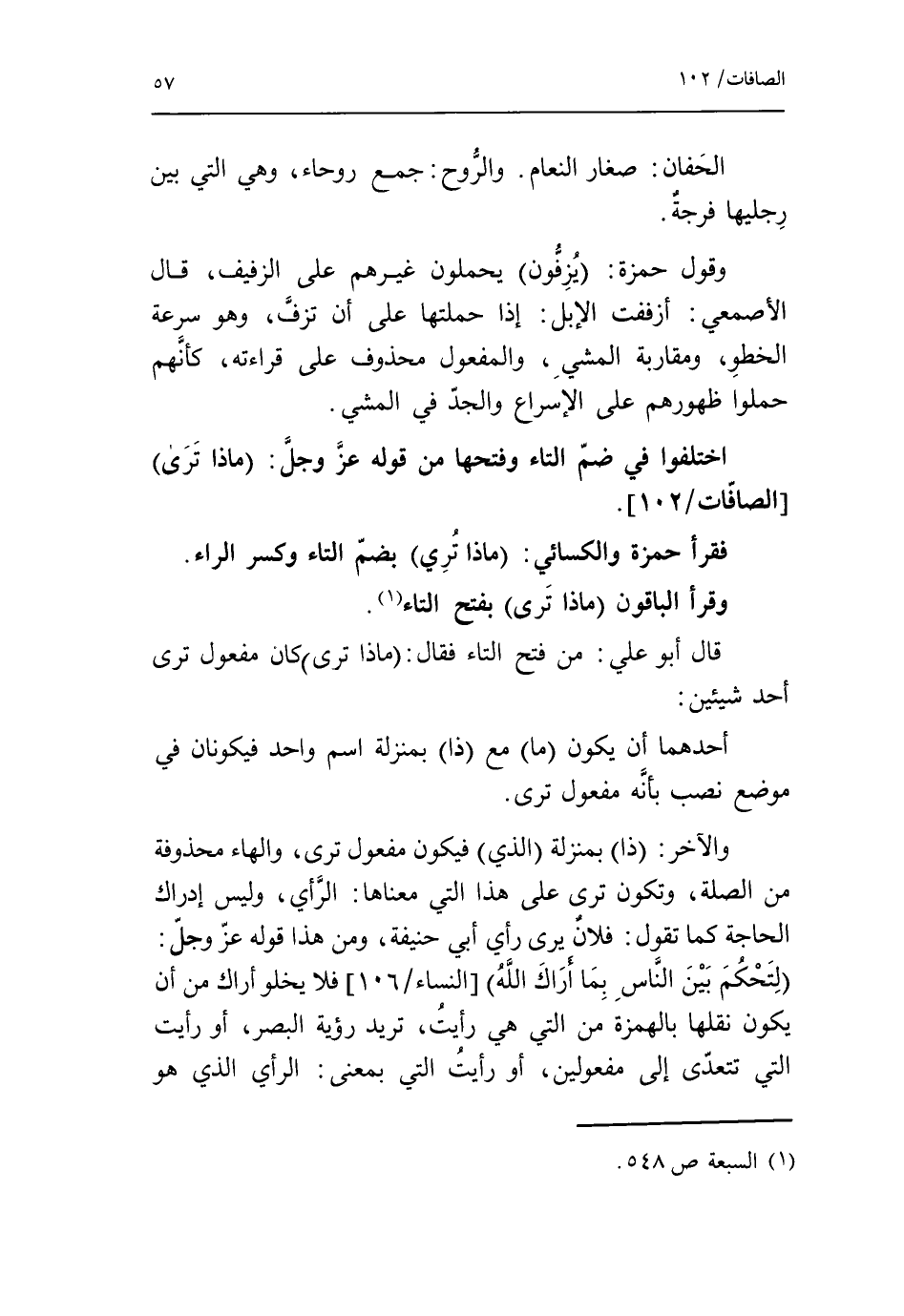 والآخر: ذا* بمنزلة الذي* فيكون مفعول ترى، والهاء محذوفة من الصلة، وتكون ترى على هذا التي معناها: الرّأي، وليس إدراك الحاجة كما تقول: فلان يرى رأي أبي حنيفة، ومن هذا قوله عزّ وجلّ: