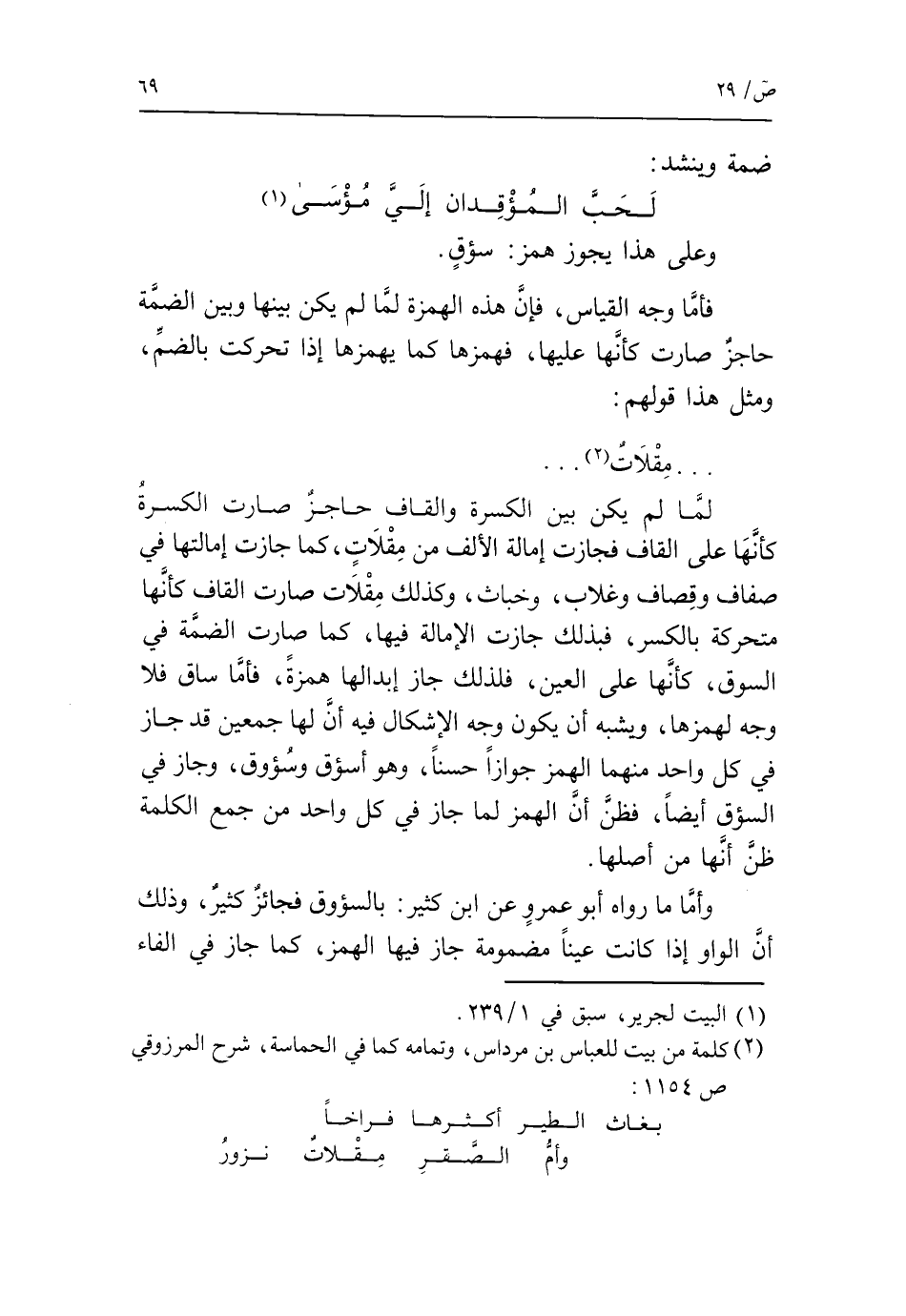 وأمّا ما رواه أبو عمرو عن ابن كثير: بالسئوق فجائز كثير، وذلك أنّ الواو إذا كانت عينا مضمومة جاز فيها الهمز، كما جاز في الفاء