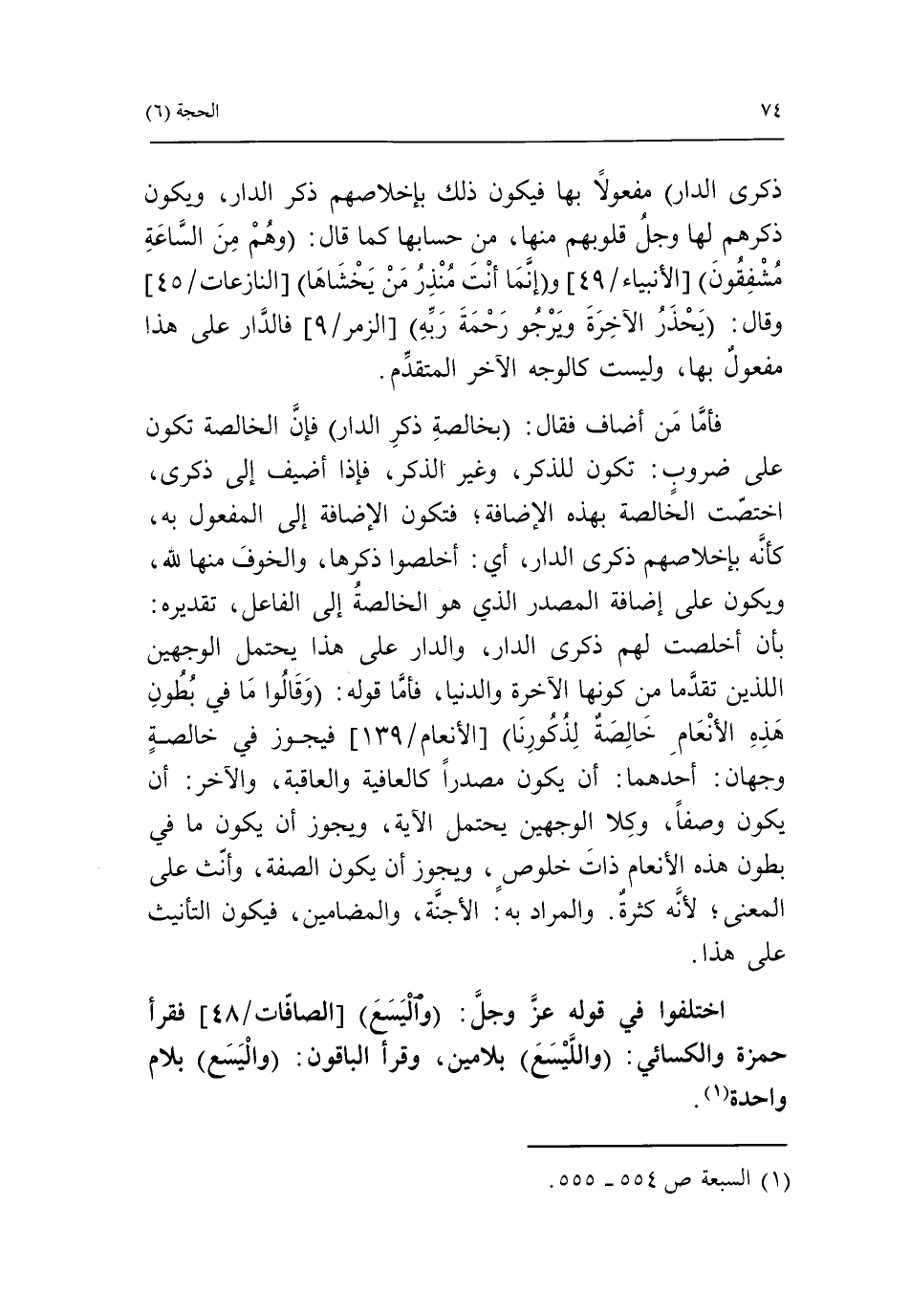 فأما من أضاف فقال: بخالصة ذكر الدار فإنّ الخالصة تكون على ضروب: تكون للذكر، وغير الذكر، فإذا أضيف إلى ذكرى، اختصّت الخالصة بهذه الإضافة، فتكون الإضافة إلى المفعول به، كأنّه بإخلاصهم ذكرى الدار، أي: أخلصوا ذكرها، والخوف منها لله، ويكون على إضافة المصدر الذي هو الخالصة إلى الفاعل، تقديره: