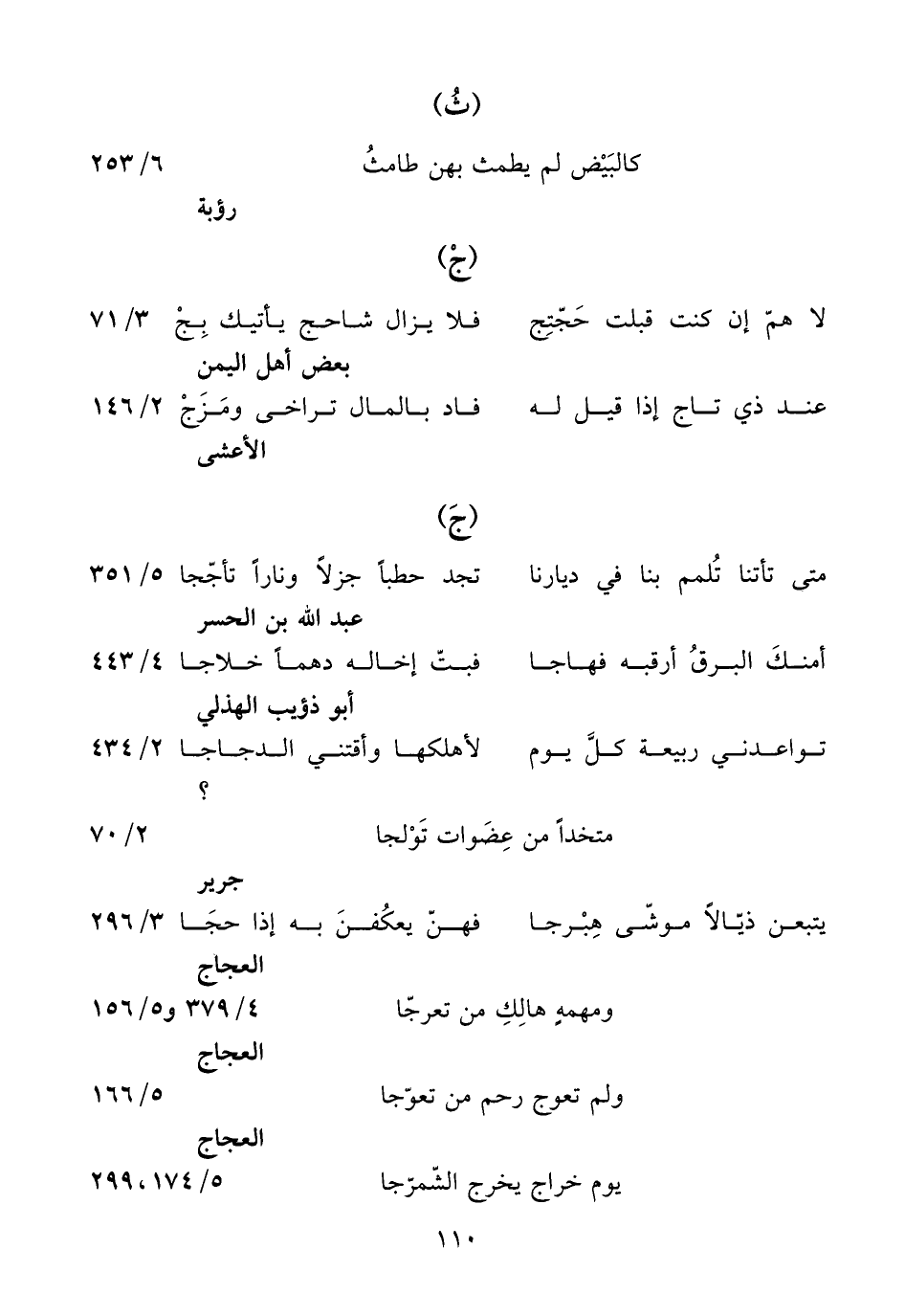 العجاج ومهمه هالك من تعرّجا 4/ 379 و 5/ 156 العجاج ولم تعوج رحم من تعوّجا 5/ 166 العجاج يوم خراج يخرج الشّمرّجا 5/ 174، 299