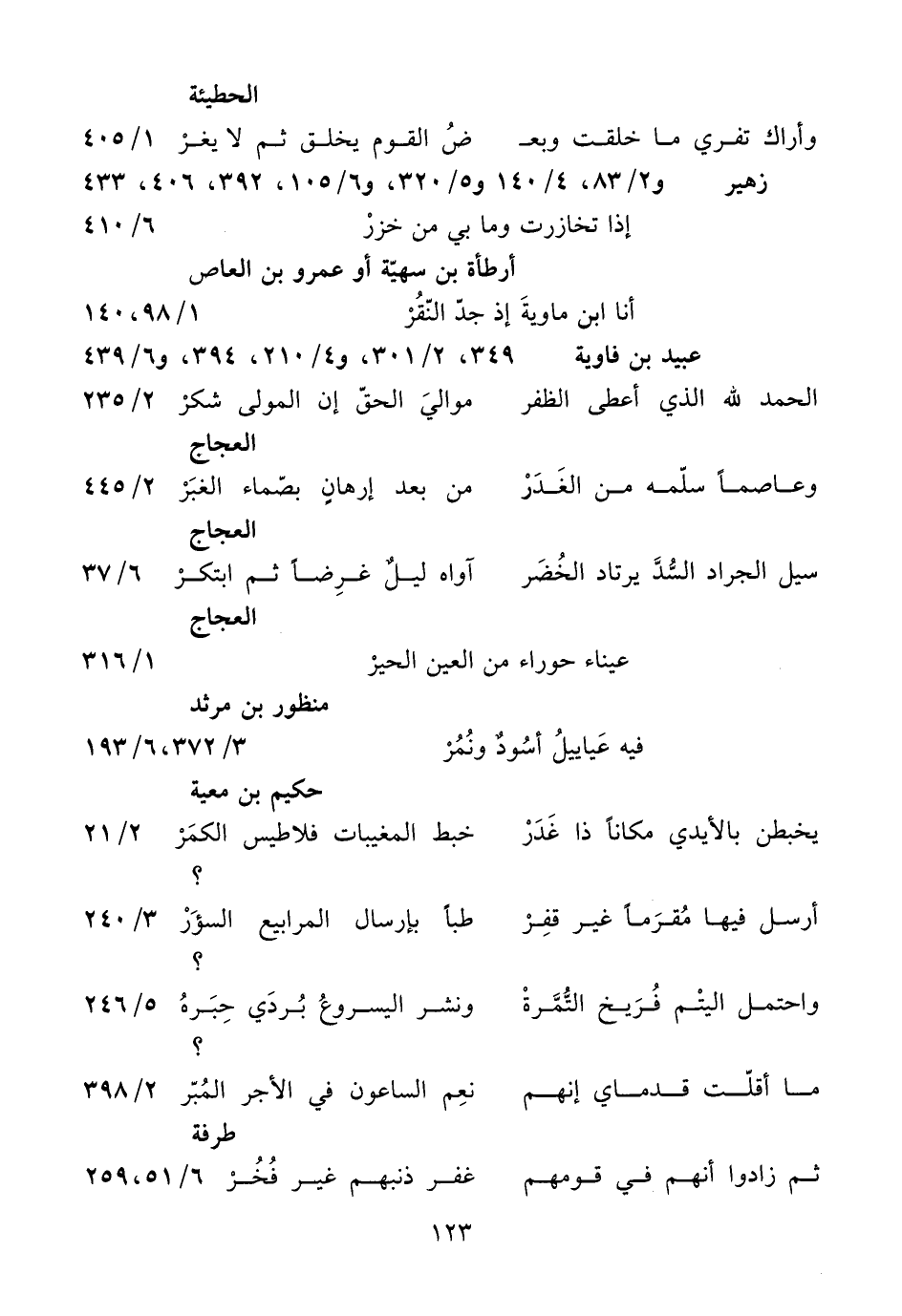 زهير و 2/ 83، 4/ 140 و 5/ 320، و 6/ 105، 392، 406، 433 إذا تخازرت وما بي من خزر 6/ 410 أرطأة بن سهيّة أو عمرو بن العاص أنا ابن ماوية إذ جدّ النّقر 1/ 98، 140 عبيد بن فاوية 349، 2/ 301، و 4/ 210، 394، و 6/ 439