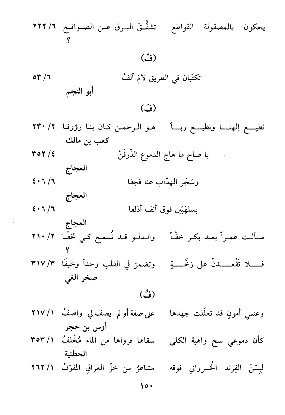 كعب بن مالك يا صاح ما هاج الدموع الذّرفن 4/ 352 العجاج وسجر الهدّاب عنا فجفا 6/ 406 العجاج بسلهبين فوق أنف أذلفا 6/ 406 العجاج