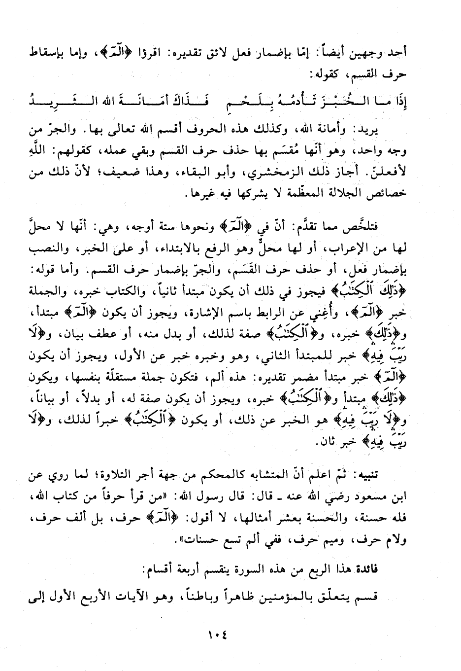 تنبيه: ثمّ اعلم أنّ المتشابه كالمحكم من جهة أجر التلاوة؛ لما روي عن ابن مسعود رضي الله عنه - قال: قال رسول الله: «من قرأ حرفا من كتاب الله، فله حسنة، والحسنة بعشر أمثالها، لا أقول: {الم} حرف، بل ألف حرف، ولام حرف، وميم حرف، ففي ألم تسع حسنات».