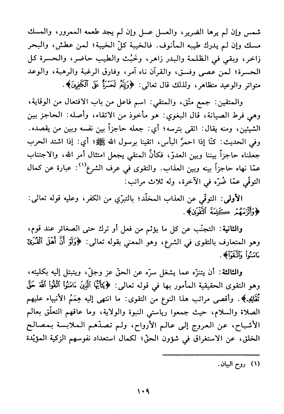 والثالثة: أن يتنزّه عما يشغل سرّه عن الحقّ عز وجلّ، ويتبتل إليه بكليته، وهو التقوى الحقيقية المأمور بها في قوله تعالى: {يا أَيُّهَا الَّذِينَ آمَنُوا اتَّقُوا اللَّهَ حَقَّ تُقاتِهِ}. وأقصى مراتب هذا النوع من التقوى: ما انتهى إليه همم الأنبياء عليهم الصلاة والسلام، حيث جمعوا رياستي النبوة والولاية، وما عاقهم التعلّق بعالم الأشباح، عن العروج إلى عالم الأرواح، ولم تصدّهم الملابسة بمصالح الخلق، عن الاستغراق في شؤون الحقّ؛ لكمال استعداد نفوسهم الزكية المؤيّدة