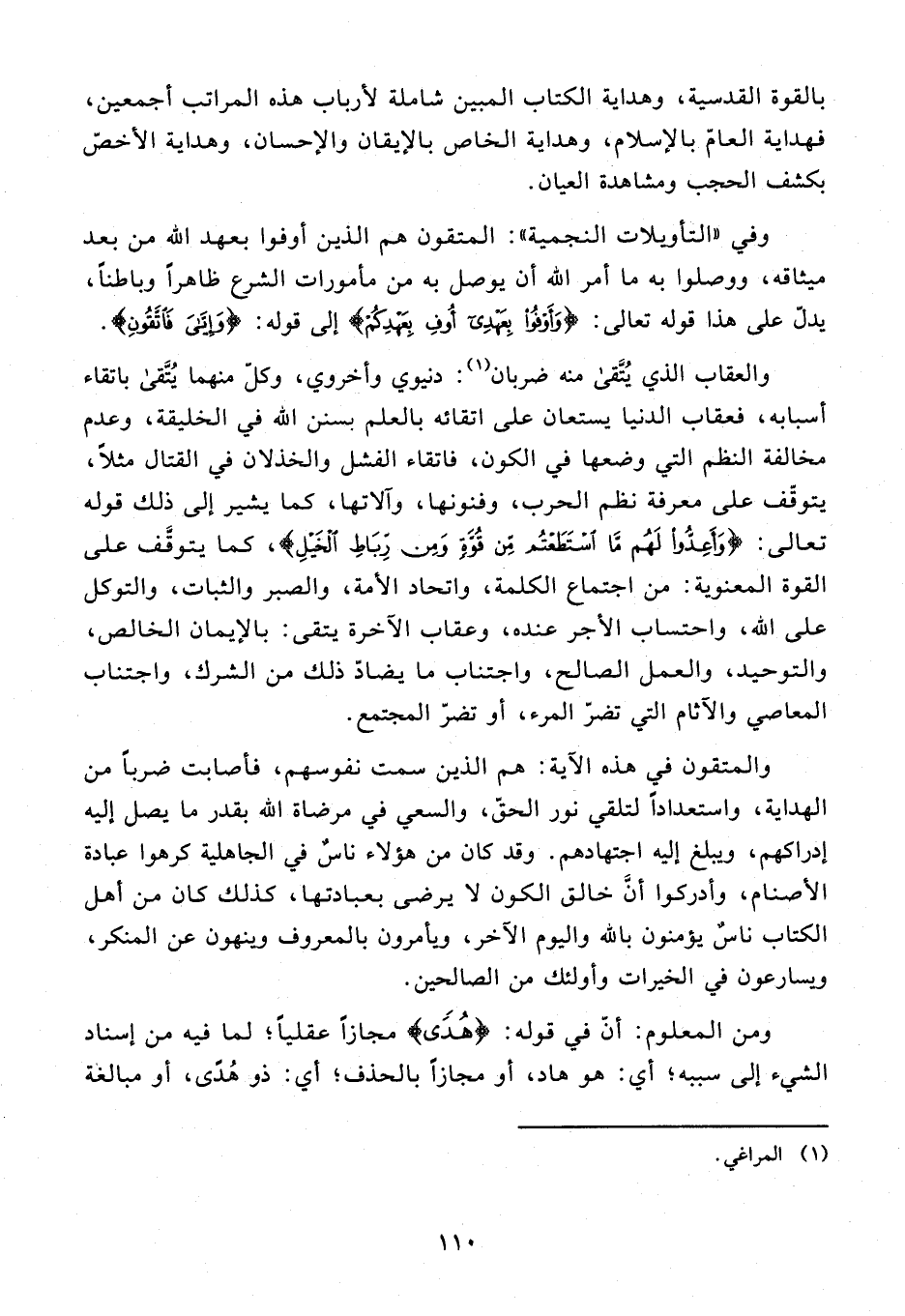 والمتقون في هذه الآية: هم الذين سمت نفوسهم، فأصابت ضربا من الهداية، واستعدادا لتلقي نور الحقّ، والسعي في مرضاة الله بقدر ما يصل إليه إدراكهم، ويبلغ إليه اجتهادهم. وقد كان من هؤلاء ناس في الجاهلية كرهوا عبادة الأصنام، وأدركوا أنّ خالق الكون لا يرضى بعبادتها، كذلك كان من أهل الكتاب ناس يؤمنون بالله واليوم الآخر، ويأمرون بالمعروف وينهون عن المنكر، ويسارعون في الخيرات وأولئك من الصالحين.