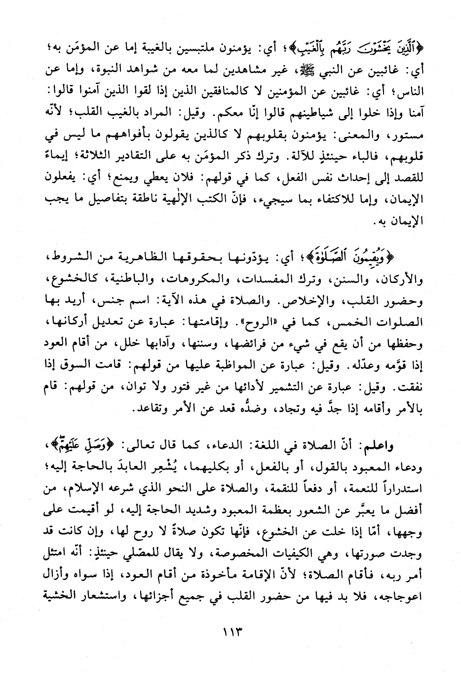 واعلم: أنّ الصلاة في اللغة: الدعاء، كما قال تعالى: {وَصَلِّ عَلَيْهِمْ}، ودعاء المعبود بالقول، أو بالفعل، أو بكليهما، يشعر العابد بالحاجة إليه؛ استدرارا للنعمة، أو دفعا للنقمة، والصلاة على النحو الذي شرعه الإسلام، من أفضل ما يعبّر عن الشعور بعظمة المعبود وشديد الحاجة إليه، لو أقيمت على وجهها، أمّا إذا خلت عن الخشوع، فإنّها تكون صلاة لا روح لها، وإن كانت قد وجدت صورتها، وهي الكيفيات المخصوصة، ولا يقال للمصّلي حينئذ: أنّه امتثل أمر ربه، فأقام الصلاة؛ لأنّ الإقامة مأخوذة من أقام العود، إذا سواه وأزال اعوجاجه، فلا بد فيها من حضور القلب في جميع أجزائها، واستشعار الخشية