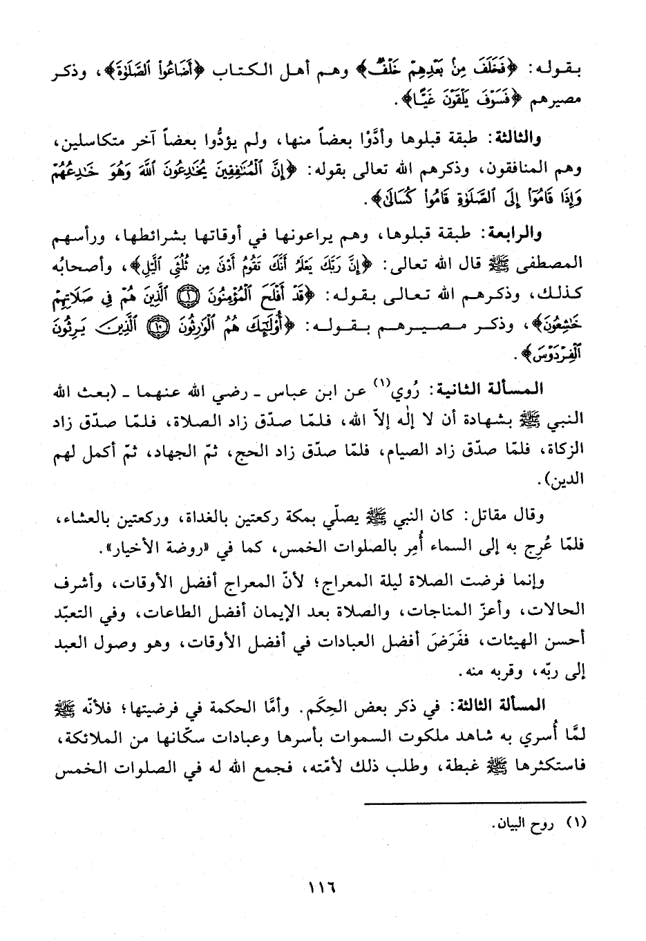 والرابعة: طبقة قبلوها، وهم يراعونها في أوقاتها بشرائطها، ورأسهم المصطفى صلّى الله عليه وسلّم قال الله تعالى: {إِنَّ رَبَّكَ يَعْلَمُ أَنَّكَ تَقُومُ أَدْنى مِنْ ثُلُثَيِ اللَّيْلِ}، وأصحابه كذلك، وذكرهم الله تعالى بقوله: {قَدْ أَفْلَحَ الْمُؤْمِنُونَ (1) الَّذِينَ هُمْ فِي صَلاتِهِمْ خاشِعُونَ}، وذكر مصيرهم بقوله: {أُولئِكَ هُمُ الْوارِثُونَ (10) الَّذِينَ يَرِثُونَ الْفِرْدَوْسَ}.