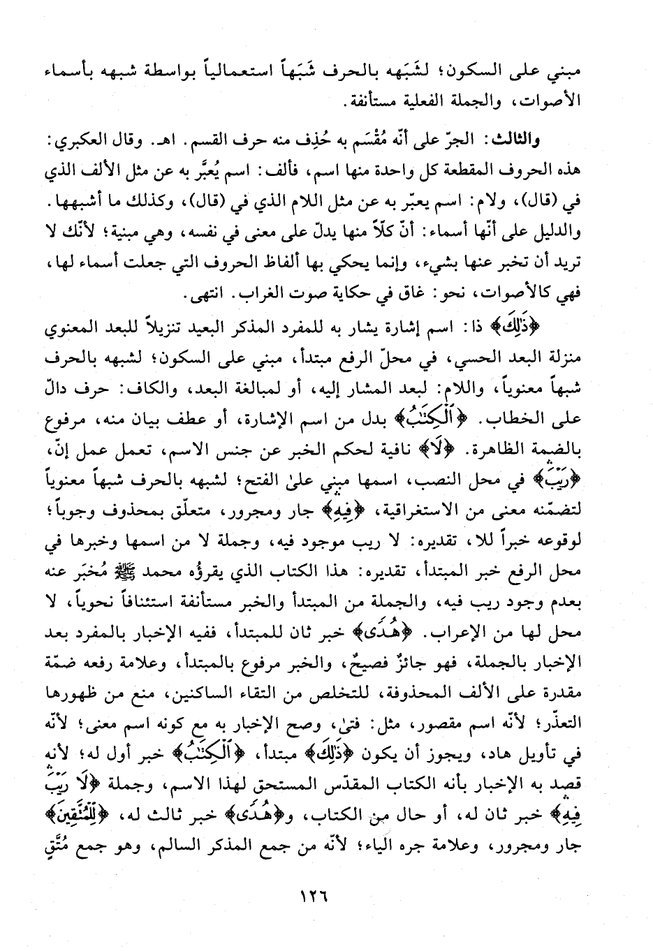{ذلِكَ} ذا: اسم إشارة يشار به للمفرد المذكر البعيد تنزيلا للبعد المعنوي منزلة البعد الحسي، في محلّ الرفع مبتدأ، مبني على السكون؛ لشبهه بالحرف شبها معنويا، واللام: لبعد المشار إليه، أو لمبالغة البعد، والكاف: حرف دالّ على الخطاب. {الْكِتابُ} بدل من اسم الإشارة، أو عطف بيان منه، مرفوع بالضمة الظاهرة. {لا} نافية لحكم الخبر عن جنس الاسم، تعمل عمل إنّ، {رَيْبَ} في محل النصب، اسمها مبني على الفتح؛ لشبهه بالحرف شبها معنويا لتضمّنه معنى من الاستغراقية، {فِيهِ} جار ومجرور، متعلّق بمحذوف وجوبا؛ لوقوعه خبرا للا، تقديره: لا ريب موجود فيه، وجملة لا من اسمها وخبرها في محل الرفع خبر المبتدأ، تقديره: هذا الكتاب الذي يقرؤه محمد صلّى الله عليه وسلّم مخبر عنه بعدم وجود ريب فيه، والجملة من المبتدأ والخبر مستأنفة استئنافا نحويا، لا محل لها من الإعراب. {هُدىً} خبر ثان للمبتدأ، ففيه الإخبار بالمفرد بعد الإخبار بالجملة، فهو جائز فصيح، والخبر مرفوع بالمبتدأ، وعلامة رفعه ضمّة مقدرة على الألف المحذوفة، للتخلص من التقاء الساكنين، منع من ظهورها التعذّر؛ لأنّه اسم مقصور، مثل: فتى، وصح الإخبار به مع كونه اسم معنى؛ لأنّه في تأويل هاد، ويجوز أن يكون {ذلِكَ} مبتدأ، {الْكِتابُ} خبر أول له؛ لأنه قصد به الإخبار بأنه الكتاب المقدّس المستحق لهذا الاسم، وجملة {لا رَيْبَ فِيهِ} خبر ثان له، أو حال من الكتاب، و {هُدىً} خبر ثالث له، {لِلْمُتَّقِينَ} جار ومجرور، وعلامة جره الياء؛ لأنّه من جمع المذكر السالم، وهو جمع متّق