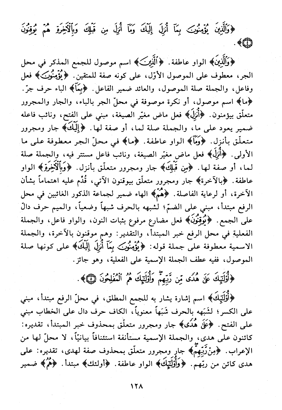 {وَالَّذِينَ} الواو عاطفة. {الَّذِينَ} اسم موصول للجمع المذكر في محل الجر، معطوف على الموصول الأوّل، على كونه صفة للمتقين. {يُؤْمِنُونَ} فعل وفاعل، والجملة صلة الموصول، والعائد ضمير الفاعل. {بِما} الباء حرف جرّ. {ما} اسم موصول، أو نكرة موصوفة في محلّ الجر بالباء، والجار والمجرور متعلّق بيؤمنون. {أُنْزِلَ} فعل ماض مغيّر الصيغة، مبني على الفتح، ونائب فاعله ضمير يعود على ما، والجملة صلة لما، أو صفة لها. {إِلَيْكَ} جار ومجرور متعلّق بأنزل. {وَما} الواو عاطفة. ما في محلّ الجر معطوفة على ما الأولى. {أُنْزِلَ} فعل ماض مغيّر الصيغة، ونائب فاعل مستتر فيه، والجملة صلة لما، أو صفة لها. {مِنْ قَبْلِكَ} جار ومجرور متعلّق بأنزل. {وَبِالْآخِرَةِ} الواو عاطفة. {بِالْآخِرَةِ} جار ومجرور متعلّق بيوقنون الآتي، قدّم عليه اهتماما بشأن الآخرة، أو لرعاية الفاصلة. {هُمْ} الهاء ضمير لجماعة الذكور الغائبين في محل الرفع مبتدأ، مبني على الضمّ؛ لشبهه بالحرف شبها وضعيا، والميم حرف دالّ على الجمع. {يُوقِنُونَ} فعل مضارع مرفوع بثبات النون، والواو فاعل، والجملة الفعلية في محل الرفع خبر المبتدأ، والتقدير: وهم موقنون بالآخرة، والجملة الاسمية معطوفة على جملة قوله: {يُؤْمِنُونَ بِما أُنْزِلَ إِلَيْكَ} على كونها صلة الموصول، ففيه عطف الجملة الإسمية على الفعلية، وهو جائز.
