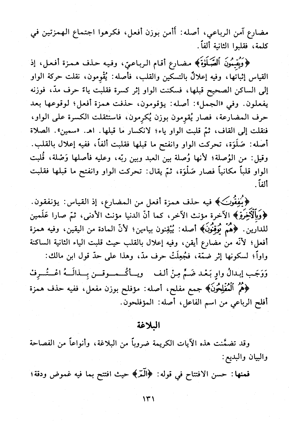 {يُنْفِقُونَ} فيه حذف همزة أفعل من المضارع، إذ القياس: يؤنفقون. {وَبِالْآخِرَةِ} الآخرة مؤنث الآخر، كما أنّ الدنيا مؤنث الأدنى، ثمّ صارا علمين للدارين. {هُمْ يُوقِنُونَ} أصله: ييقنون بياءين؛ لأنّ المادة من اليقين، وفيه همزة أفعل؛ لأنّه من مضارع أيقن، وفيه إعلال بالقلب حيث قلبت الياء الثانية الساكنة واوا؛ لسكونها إثر ضمّة، فجعلت حرف مدّ، وهذا على حدّ قول ابن مالك: