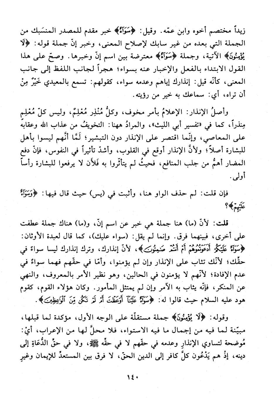 قلت: لأنّ (ما) هنا جملة هي خبر عن اسم إنّ، و (ما) هناك جملة عطفت على أخرى، فبينهما فرق. وإنما لم يقل: (سواء عليك)، كما قال لعبدة الأوثان: {سَواءٌ عَلَيْكُمْ أَدَعَوْتُمُوهُمْ أَمْ أَنْتُمْ صامِتُونَ}، لأنّ إنذارك، وترك إنذارك ليسا سواء في حقّك؛ لأنّك تثاب على الإنذار وإن لم يؤمنوا، وأمّا في حقّهم فهما سواء في عدم الإفادة؛ لأنّهم لا يؤمنون في الحالين، وهو نظير الأمر بالمعروف، والنهي عن المنكر، فإنّه يثاب به الآمر وإن لم يمتثل المأمور. وكان هؤلاء القوم، كقوم هود عليه السلام حيث قالوا له: {سَواءٌ عَلَيْنا أَوَعَظْتَ أَمْ لَمْ تَكُنْ مِنَ الْواعِظِينَ}.