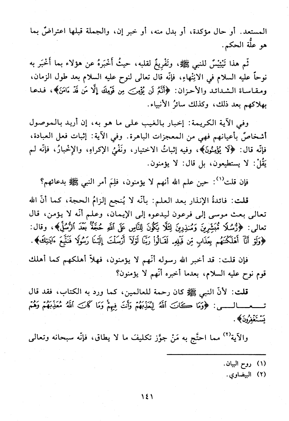 وفي الآية الكريمة: إخبار بالغيب على ما هو به، إن أريد بالموصول أشخاص بأعيانهم فهي من المعجزات الباهرة. وفي الآية: إثبات فعل العبادة، فإنّه قال: {لا يُؤْمِنُونَ}، وفيه إثبات الاختيار، ونفي الإكراه، والإخبار، فإنّه لم يقل: لا يستطيعون، بل قال: لا يؤمنون.