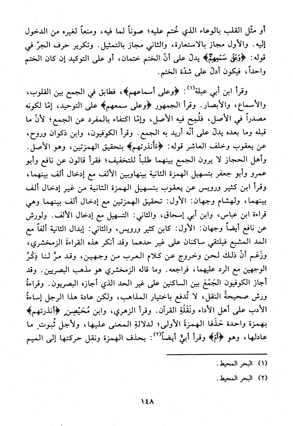 وقرأ ابن أبي عبلة (¬1): {وعلى أسماعهم}، فطابق في الجمع بين القلوب، والأسماع، والأبصار. وقرأ الجمهور {وَعَلى سَمْعِهِمْ} على التوحيد، إمّا لكونه مصدرا في الأصل، فلمح فيه الأصل، وإمّا اكتفاء بالمفرد عن الجمع؛ لأنّ ما قبله وما بعده يدلّ على أنّه أريد به الجمع. وقرأ الكوفيون، وابن ذكوان وروح، عن يعقوب وخلف العاشر قوله: أَأَنْذَرْتَهُمْ بتحقيق الهمزتين، وهو الأصل. وأهل الحجاز لا يرون الجمع بينهما طلبا للتخفيف؛ فقرأ قالون عن نافع وأبو عمرو وأبو جعفر بتسهيل الهمزة الثانية بينها وبين الألف مع إدخال ألف بينهما، وقرأ ابن كثير ورويس عن يعقوب بتسهيل الهمزة الثانية من غير إدخال ألف بينهما، ولهشام وجهان: الأول: تحقيق الهمزتين مع إدخال ألف بينهما وهي قراءة ابن عباس، وابن أبي إسحاق، والثاني: التسهيل مع إدخال الألف. ولورش عن نافع أيضا وجهان: الأول: كابن كثير ورويس، والثاني: إبدال الثانية ألفا مع المد المشبع فيلتقي ساكنان على غير حدهما وقد أنكر هذه القراءة الزمخشري، وزعم أنّ ذلك لحن وخروج عن كلام العرب من وجهين، وقد مرّ لنا ذكر الوجهين مع الرد عليهما، فراجعه. وما قاله الزمخشري هو مذهب البصريين. وقد أجاز الكوفيون الجمع بين الساكنين على غير الحد الذي أجازه البصريون. وقراءة ورش صحيحة النقل، لا تدفع باختيار المذاهب، ولكن عادة هذا الرجل إساءة الأدب على أهل الأداء ونقلة القرآن. وقرأ الزهري، وابن محيصن {أنذرتهم} بهمزة واحدة حذفا الهمزة الأولى؛ لدلالة المعنى عليها، ولأجل ثبوت ما عادلها، وهو {أَمْ} وقرأ أبيّ أيضا (¬2): بحذف الهمزة ونقل حركتها إلى الميم