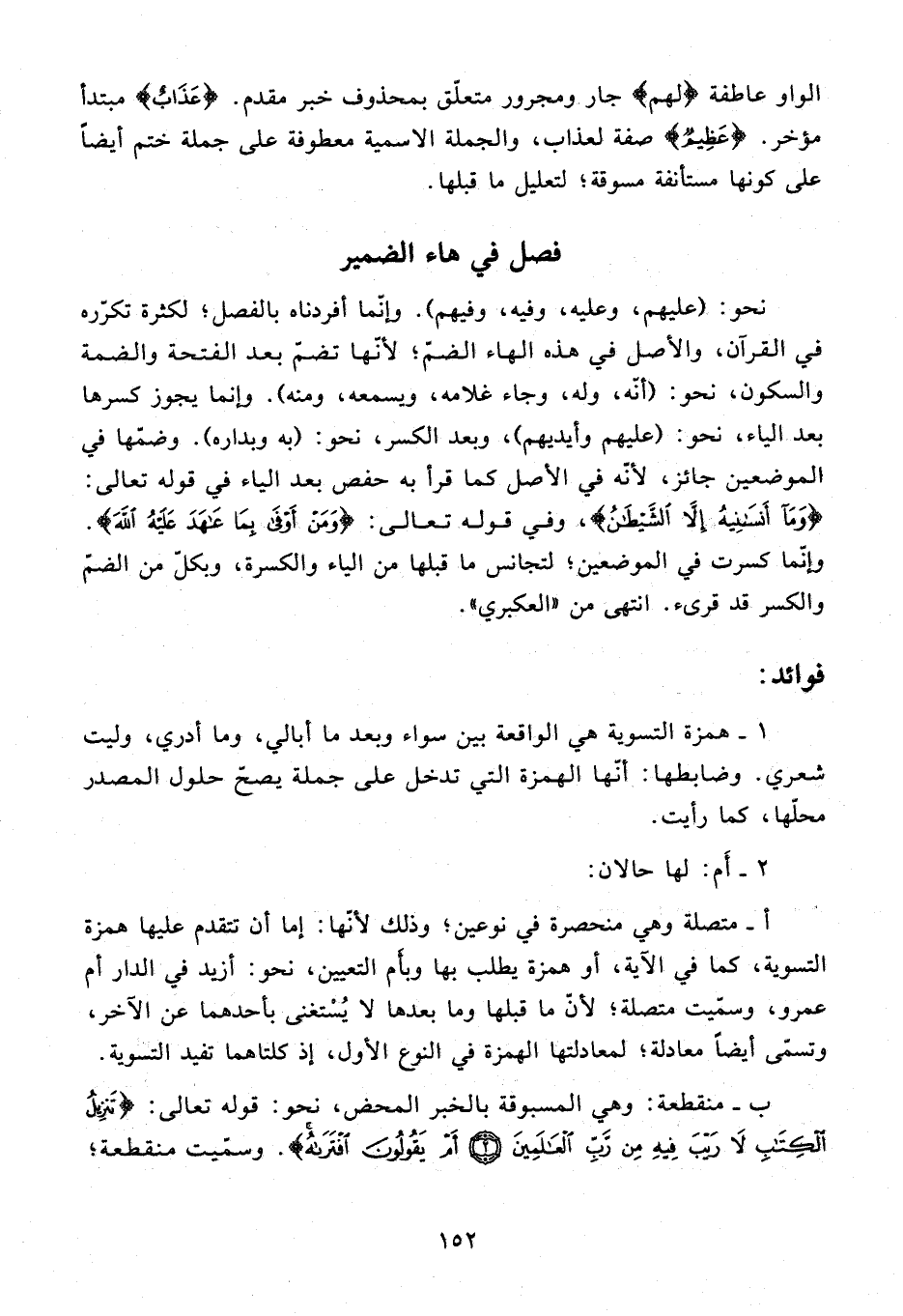 نحو: (عليهم، وعليه، وفيه، وفيهم). وإنّما أفردناه بالفصل؛ لكثرة تكرّره في القرآن، والأصل في هذه الهاء الضمّ؛ لأنّها تضمّ بعد الفتحة والضمة والسكون، نحو: (أنّه، وله، وجاء غلامه، ويسمعه، ومنه). وإنما يجوز كسرها بعد الياء، نحو: (عليهم وأيديهم)، وبعد الكسر، نحو: (به وبداره). وضمّها في الموضعين جائز، لأنّه في الأصل كما قرأ به حفص بعد الياء في قوله تعالى: {وَما أَنْسانِيهُ إِلَّا الشَّيْطانُ}، وفي قوله تعالى: {وَمَنْ أَوْفى بِما عاهَدَ عَلَيْهُ اللَّهَ}.