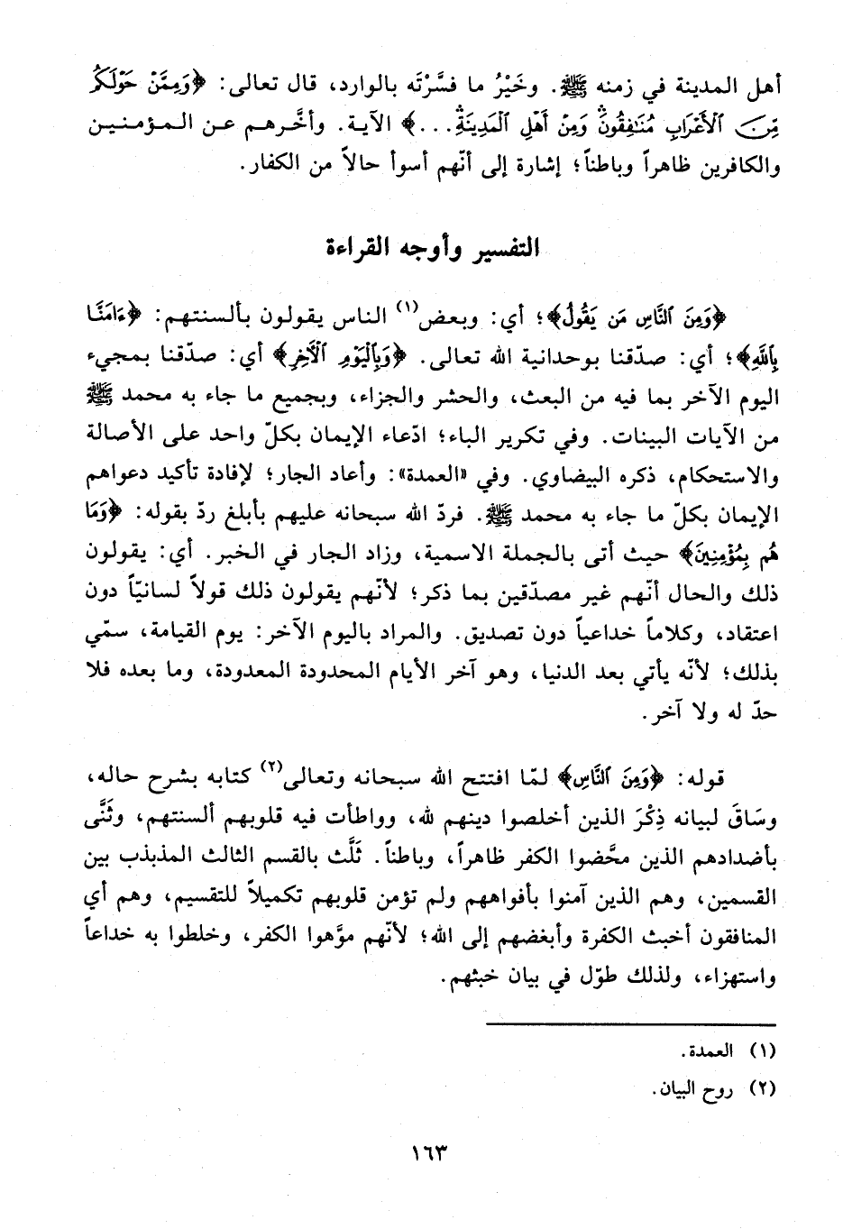 8 - {وَمِنَ النَّاسِ مَنْ يَقُولُ}؛ أي: وبعض (¬1) الناس يقولون بألسنتهم: {آمَنَّا بِاللَّهِ}؛ أي: صدّقنا بوحدانية الله تعالى. {وَبِالْيَوْمِ الْآخِرِ} أي: صدّقنا بمجيء اليوم الآخر بما فيه من البعث، والحشر والجزاء، وبجميع ما جاء به محمد صلّى الله عليه وسلّم من الآيات البينات. وفي تكرير الباء؛ ادّعاء الإيمان بكلّ واحد على الأصالة والاستحكام، ذكره البيضاوي. وفي «العمدة»: وأعاد الجار؛ لإفادة تأكيد دعواهم الإيمان بكلّ ما جاء به محمد صلّى الله عليه وسلّم. فردّ الله سبحانه عليهم بأبلغ ردّ بقوله: {وَما هُمْ بِمُؤْمِنِينَ} حيث أتى بالجملة الاسمية، وزاد الجار في الخبر. أي: يقولون ذلك والحال أنّهم غير مصدّقين بما ذكر؛ لأنّهم يقولون ذلك قولا لسانيّا دون اعتقاد، وكلاما خداعيا دون تصديق. والمراد باليوم الآخر: يوم القيامة، سمّي بذلك؛ لأنّه يأتي بعد الدنيا، وهو آخر الأيام المحدودة المعدودة، وما بعده فلا حدّ له ولا آخر.