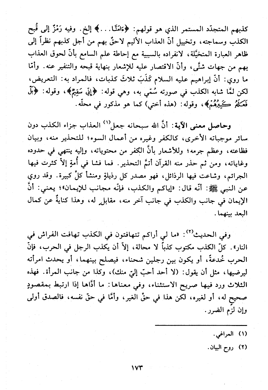 وفي الحديث (¬2): «ما لي أراكم تتهافتون في الكذب تهافت الفراش في النار». كلّ الكذب مكتوب كذبا لا محالة، إلّا أن يكذب الرجل في الحرب، فإنّ الحرب خدعة، أو يكون بين رجلين شحناء، فيصلح بينهما، أو يحدث امرأته ليرضيها، مثل أن يقول: (لا أحد أحبّ إليّ منك)، وكذا من جانب المرأة. فهذه الثلاث ورد فيها صريح الاستثناء، وفي معناها: ما أدّاها إذا ارتبط بمقصود صحيح له، أو لغيره، لكن هذا في حقّ الغير، وأمّا في حقّ نفسه، فالصدق أولى وإن لزم الضرر.