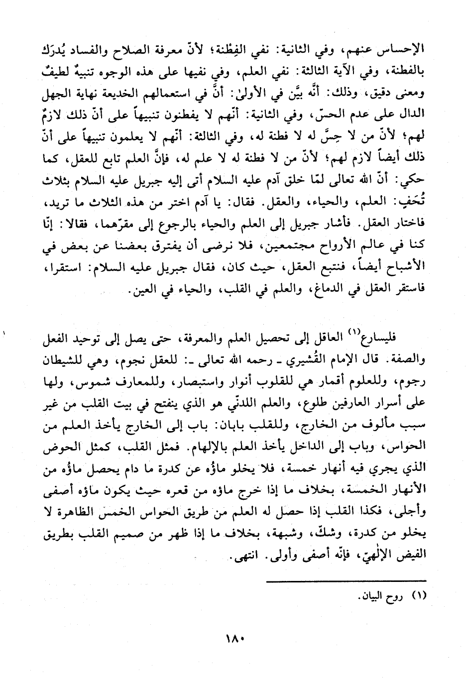 فليسارع (¬1) العاقل إلى تحصيل العلم والمعرفة، حتى يصل إلى توحيد الفعل والصفة. قال الإمام القشيري - رحمه الله تعالى -: للعقل نجوم، وهي للشيطان رجوم، وللعلوم أقمار هي للقلوب أنوار واستبصار، وللمعارف شموس، ولها على أسرار العارفين طلوع، والعلم اللدنّي هو الذي ينفتح في بيت القلب من غير سبب مألوف من الخارج، وللقلب بابان: باب إلى الخارج يأخذ العلم من الحواس، وباب إلى الداخل يأخذ العلم بالإلهام. فمثل القلب، كمثل الحوض الذي يجري فيه أنهار خمسة، فلا يخلو ماؤه عن كدرة ما دام يحصل ماؤه من الأنهار الخمسة، بخلاف ما إذا خرج ماؤه من قعره حيث يكون ماؤه أصفى وأجلى، فكذا القلب إذا حصل له العلم من طريق الحواس الخمس الظاهرة لا يخلو من كدرة، وشكّ، وشبهة، بخلاف ما إذا ظهر من صميم القلب بطريق الفيض الإلهيّ، فإنّه أصفى وأولى. انتهى.