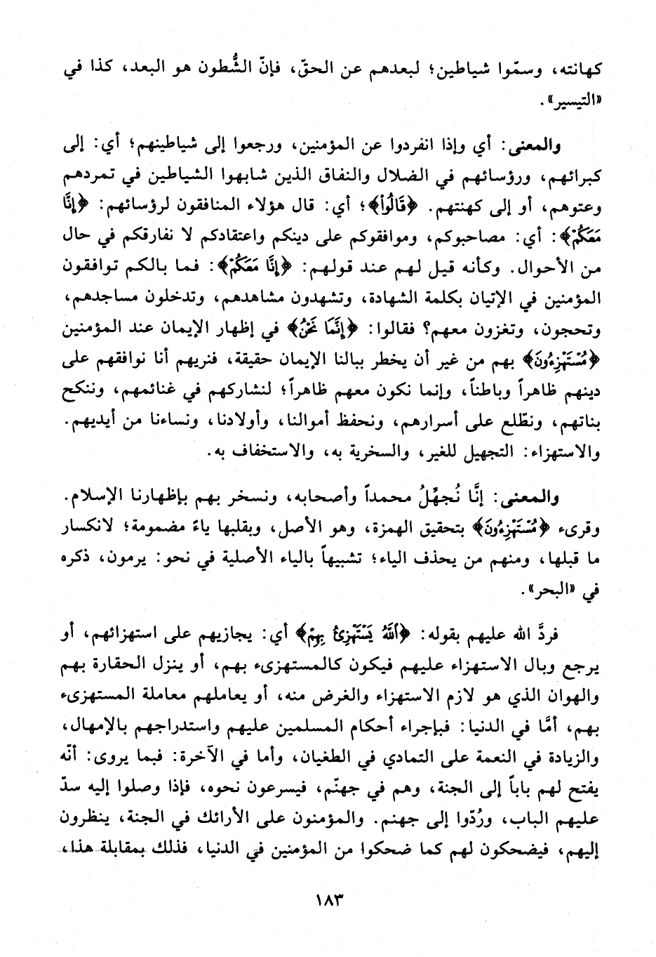 15 - فردّ الله عليهم بقوله: {اللَّهُ يَسْتَهْزِئُ بِهِمْ} أي: يجازيهم على استهزائهم، أو يرجع وبال الاستهزاء عليهم فيكون كالمستهزىء بهم، أو ينزل الحقارة بهم والهوان الذي هو لازم الاستهزاء والغرض منه، أو يعاملهم معاملة المستهزىء بهم، أمّا في الدنيا: فبإجراء أحكام المسلمين عليهم واستدراجهم بالإمهال، والزيادة في النعمة على التمادي في الطغيان، وأما في الآخرة: فبما يروى: أنّه يفتح لهم بابا إلى الجنة، وهم في جهنّم، فيسرعون نحوه، فإذا وصلوا إليه سدّ عليهم الباب، وردّوا إلى جهنم. والمؤمنون على الأرائك في الجنة، ينظرون إليهم، فيضحكون لهم كما ضحكوا من المؤمنين في الدنيا، فذلك بمقابلة هذا،