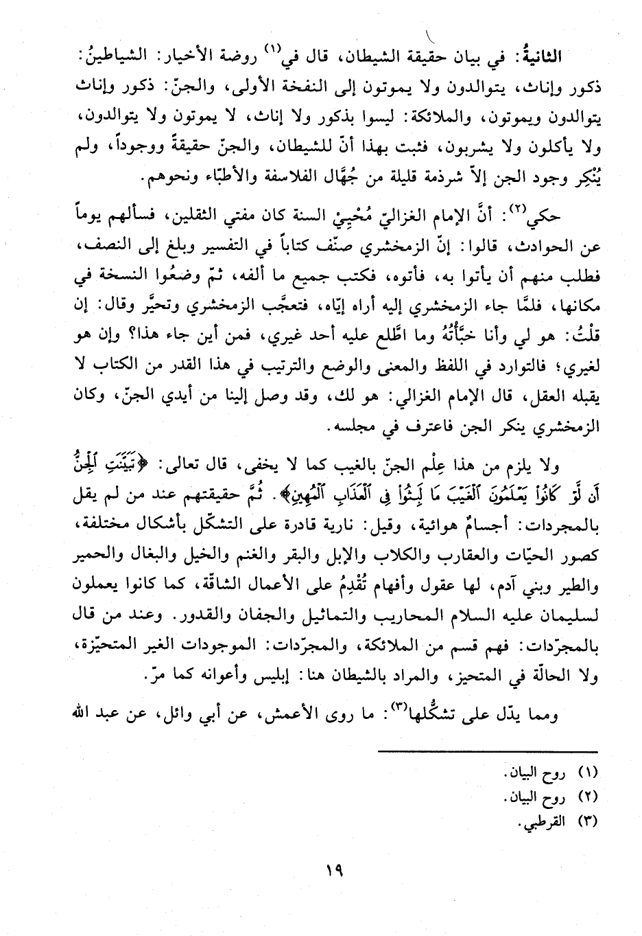 ذكور وإناث، يتوالدون ولا يموتون إلى النفخة الأولى، والجنّ: ذكور وإناث يتوالدون ويموتون، والملائكة: ليسوا بذكور ولا إناث، لا يموتون ولا يتوالدون، ولا يأكلون ولا يشربون، فثبت بهذا أنّ للشيطان، والجنّ حقيقة ووجودا، ولم ينكر وجود الجن إلّا شرذمة قليلة من جهّال الفلاسفة والأطبّاء ونحوهم.