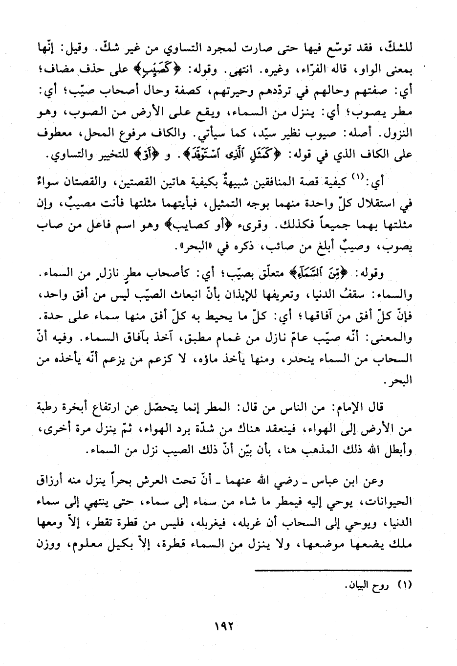 قال الإمام: من الناس من قال: المطر إنما يتحصّل عن ارتفاع أبخرة رطبة من الأرض إلى الهواء، فينعقد هناك من شدّة برد الهواء، ثمّ ينزل مرة أخرى، وأبطل الله ذلك المذهب هنا، بأن بيّن أنّ ذلك الصيب نزل من السماء.