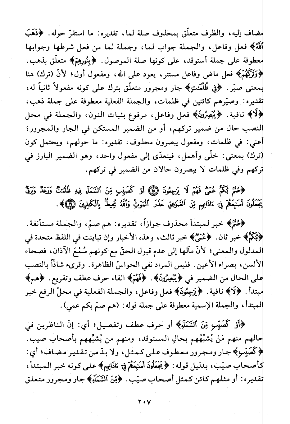 {وَتَرَكَهُمْ} فعل ماض وفاعل مستتر، يعود على الله، ومفعول أول؛ لأنّ (ترك) هنا بمعنى صيّر. {فِي ظُلُماتٍ} جار ومجرور متعلّق بترك على كونه مفعولا ثانيا له، تقديره: وصيّرهم كائنين في ظلمات، والجملة الفعلية معطوفة على جملة ذهب، {لا} نافية. {يُبْصِرُونَ} فعل وفاعل، مرفوع بثبات النون، والجملة في محل النصب حال من ضمير تركهم، أو من الضمير المستكن في الجار والمجرور؛ أعني: في ظلمات، ومفعول يبصرون محذوف، تقديره: ما حولهم، ويحتمل كون (ترك) بمعنى: خلّى وأهمل، فيتعدّى إلى مفعول واحد، وهو الضمير البارز في تركهم وفي ظلمات لا يبصرون حالان من الضمير في تركهم.