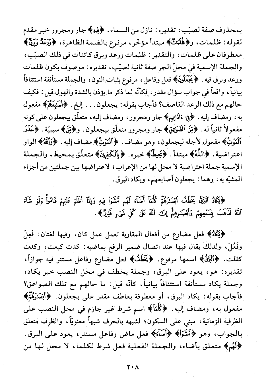 {يَكادُ} فعل مضارع من أفعال المقاربة تعمل عمل كان، وفيها لغتان: فعل وفعل، ولذلك يقال فيها عند اتصال ضمير الرفع بماضيه: كدت كبعت، وكدت كقلت. {الْبَرْقُ} اسمها مرفوع. {يَخْطَفُ} فعل مضارع وفاعل مستتر فيه جوازا، تقديره: هو، يعود على البرق، وجملة يخطف في محل النصب خبر يكاد، وجملة يكاد مستأنفة استئنافا بيانيا، كأنّه قيل: ما حالهم مع تلك الصواعق؟ فأجاب بقوله: يكاد البرق، أو معطوفة بعاطف مقدر على يجعلون. {أَبْصارَهُمْ} مفعول به، ومضاف إليه. {كُلَّما} اسم شرط غير جازم في محل النصب على الظرفية الزمانية، مبني على السكون؛ لشبهه بالحرف شبها معنويّا، والظرف متعلق بالجواب، وهو {مَشَوْا} {أَضاءَ} فعل ماض وفاعل مستتر، يعود على البرق. {لَهُمْ} متعلق بأضاء، والجملة الفعلية فعل شرط لكلما، لا محل لها من
