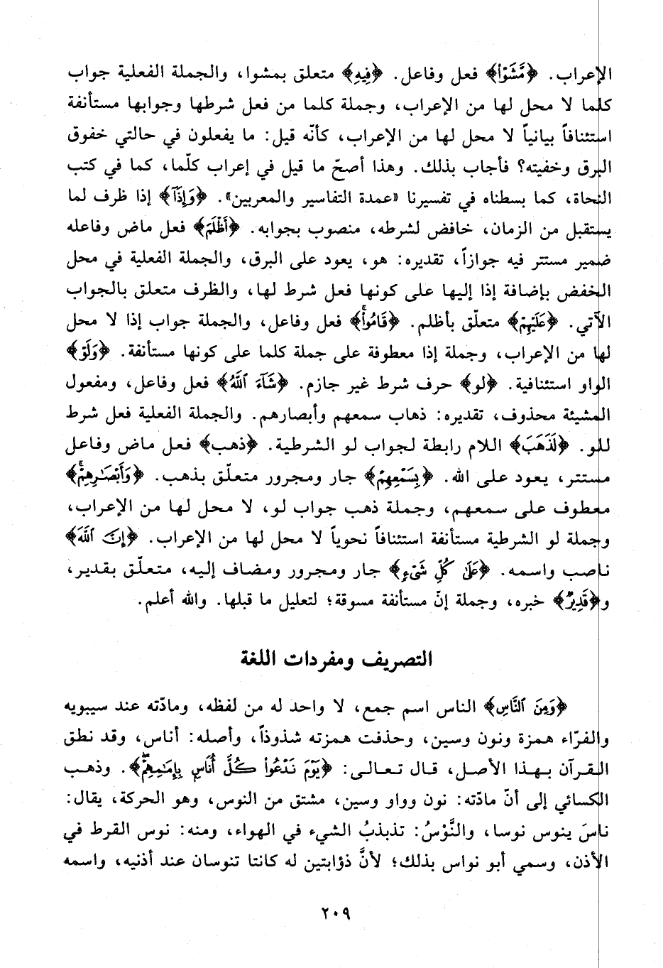 الإعراب. {مَشَوْا} فعل وفاعل. {فِيهِ} متعلق بمشوا، والجملة الفعلية جواب كلما لا محل لها من الإعراب، وجملة كلما من فعل شرطها وجوابها مستأنفة استئنافا بيانيا لا محل لها من الإعراب، كأنّه قيل: ما يفعلون في حالتي خفوق البرق وخفيته؟ فأجاب بذلك. وهذا أصحّ ما قيل في إعراب كلّما، كما في كتب النحاة، كما بسطناه في تفسيرنا «عمدة التفاسير والمعربين». {وَإِذا} إذا ظرف لما يستقبل من الزمان، خافض لشرطه، منصوب بجوابه. {أَظْلَمَ} فعل ماض وفاعله ضمير مستتر فيه جوازا، تقديره: هو، يعود على البرق، والجملة الفعلية في محل الخفض بإضافة إذا إليها على كونها فعل شرط لها، والظرف متعلق بالجواب الآتي. {عَلَيْهِمْ} متعلّق بأظلم. {قامُوا} فعل وفاعل، والجملة جواب إذا لا محل لها من الإعراب، وجملة إذا معطوفة على جملة كلما على كونها مستأنفة. {وَلَوْ} الواو استئنافية. لَوْ حرف شرط غير جازم. {شاءَ اللَّهُ} فعل وفاعل، ومفعول المشيئة محذوف، تقديره: ذهاب سمعهم وأبصارهم. والجملة الفعلية فعل شرط للو. {لَذَهَبَ} اللام رابطة لجواب لو الشرطية. {ذهب} فعل ماض وفاعل مستتر، يعود على الله. {بِسَمْعِهِمْ} جار ومجرور متعلّق بذهب. {وَأَبْصارِهِمْ} معطوف على سمعهم، وجملة ذهب جواب لو، لا محل لها من الإعراب، وجملة لو الشرطية مستأنفة استئنافا نحويا لا محل لها من الإعراب. {إِنَّ اللَّهَ} ناصب واسمه. {عَلى كُلِّ شَيْءٍ} جار ومجرور ومضاف إليه، متعلّق بقدير، و {قَدِيرٌ} خبره، وجملة إنّ مستأنفة مسوقة؛ لتعليل ما قبلها. والله أعلم.