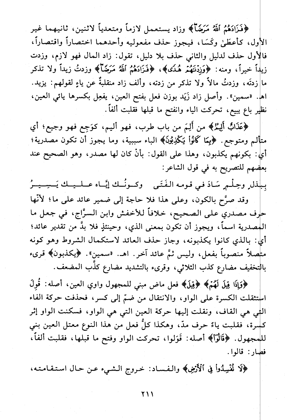{فَزادَهُمُ اللَّهُ مَرَضًا} وزاد يستعمل لازما ومتعديا لاثنين، ثانيهما غير الأول، كأعطى وكسا، فيجوز حذف مفعوليه وأحدهما اختصارا واقتصارا، فالأول حذف لدليل والثاني حذف بلا دليل، تقول: زاد المال فهو لازم، وزدت زيدا خيرا، ومنه: {وَزِدْناهُمْ هُدىً}، {فَزادَهُمُ اللَّهُ مَرَضًا} وزدت زيدا ولا تذكر ما زدته، وزدت مالا ولا تذكر من زدته، وألف زاد منقلبة عن ياء لقولهم: يزيد.