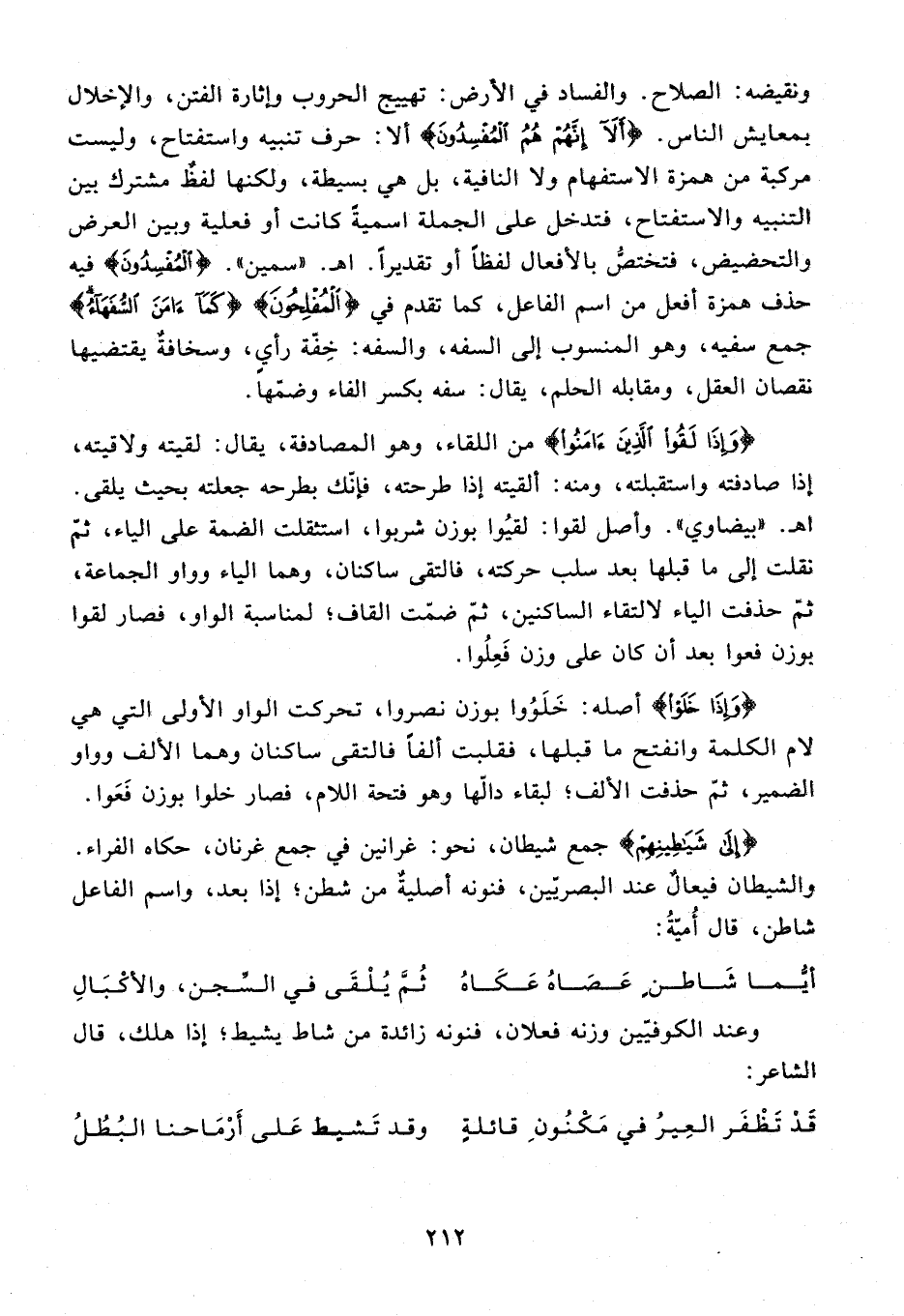 ونقيضه: الصلاح. والفساد في الأرض: تهييج الحروب وإثارة الفتن، والإخلال بمعايش الناس. {أَلا إِنَّهُمْ هُمُ الْمُفْسِدُونَ} ألا: حرف تنبيه واستفتاح، وليست مركبة من همزة الاستفهام ولا النافية، بل هي بسيطة، ولكنها لفظ مشترك بين التنبيه والاستفتاح، فتدخل على الجملة اسمية كانت أو فعلية وبين العرض والتحضيض، فتختصّ بالأفعال لفظا أو تقديرا. اه. «سمين». {الْمُفْسِدُونَ} فيه حذف همزة أفعل من اسم الفاعل، كما تقدم في {الْمُفْلِحُونَ} {كَما آمَنَ السُّفَهاءُ} جمع سفيه، وهو المنسوب إلى السفه، والسفه: خفّة رأي، وسخافة يقتضيها نقصان العقل، ومقابله الحلم، يقال: سفه بكسر الفاء وضمّها.