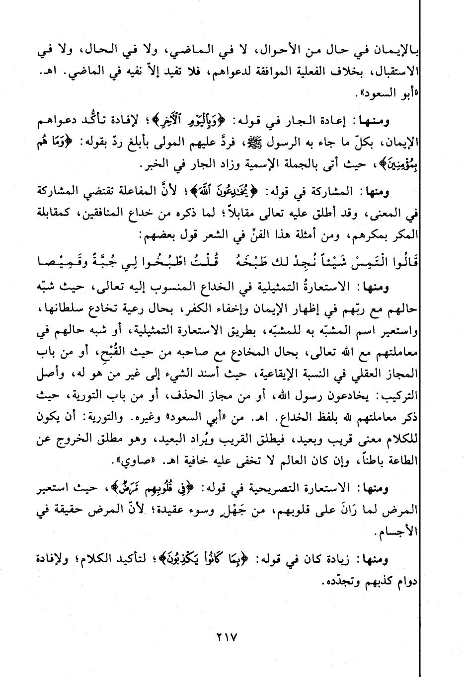 ومنها: الاستعارة التمثيلية في الخداع المنسوب إليه تعالى، حيث شبّه حالهم مع ربّهم في إظهار الإيمان وإخفاء الكفر، بحال رعية تخادع سلطانها، واستعير اسم المشبّه به للمشبّه، بطريق الاستعارة التمثيلية، أو شبه حالهم في معاملتهم مع الله تعالى، بحال المخادع مع صاحبه من حيث القبح، أو من باب المجاز العقلي في النسبة الإيقاعية، حيث أسند الشيء إلى غير من هو له، وأصل التركيب: يخادعون رسول الله، أو من مجاز الحذف، أو من باب التورية، حيث ذكر معاملتهم لله بلفظ الخداع. اه. من «أبي السعود» وغيره. والتورية: أن يكون للكلام معنى قريب وبعيد، فيطلق القريب ويراد البعيد، وهو مطلق الخروج عن الطاعة باطنا، وإن كان العالم لا تخفى عليه خافية اه. «صاوي».
