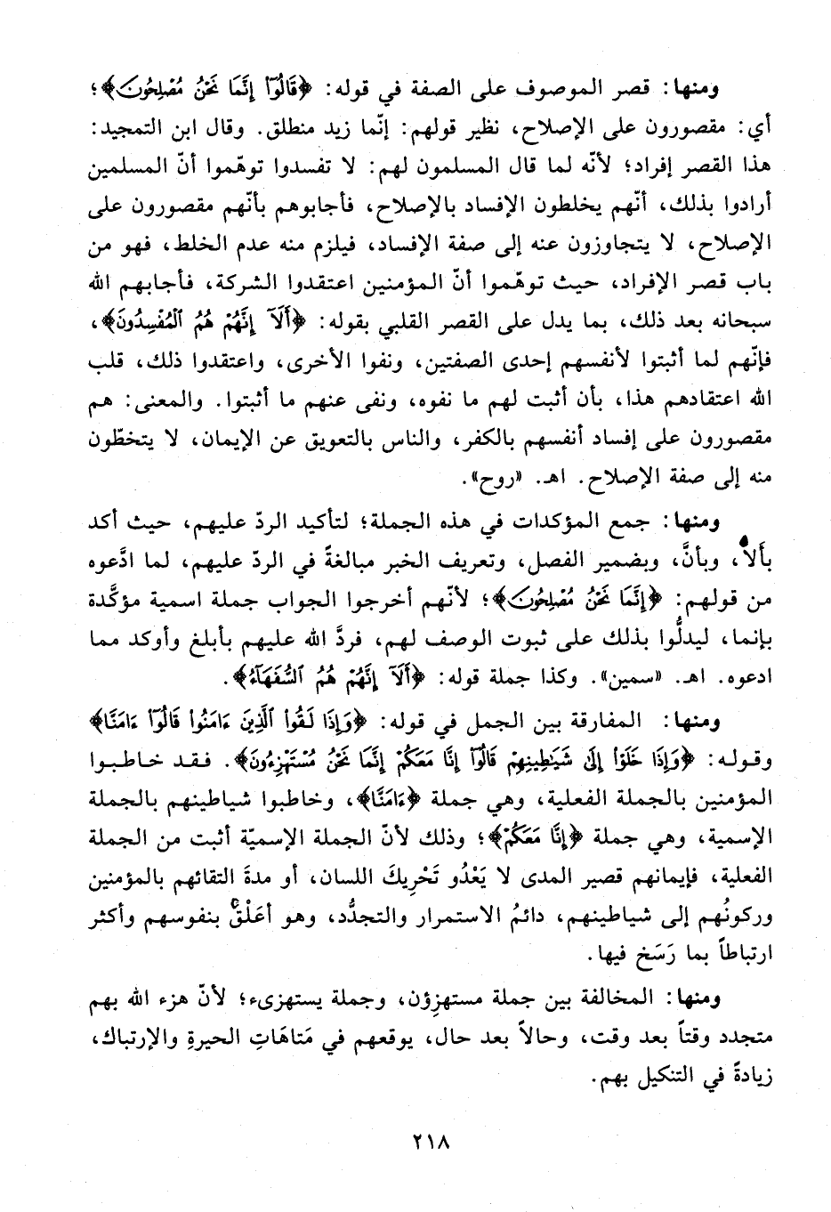 ومنها: قصر الموصوف على الصفة في قوله: {قالُوا إِنَّما نَحْنُ مُصْلِحُونَ}؛ أي: مقصورون على الإصلاح، نظير قولهم: إنّما زيد منطلق. وقال ابن التمجيد: هذا القصر إفراد؛ لأنّه لما قال المسلمون لهم: لا تفسدوا توهّموا أنّ المسلمين أرادوا بذلك، أنّهم يخلطون الإفساد بالإصلاح، فأجابوهم بأنّهم مقصورون على الإصلاح، لا يتجاوزون عنه إلى صفة الإفساد، فيلزم منه عدم الخلط، فهو من باب قصر الإفراد، حيث توهّموا أنّ المؤمنين اعتقدوا الشركة، فأجابهم الله سبحانه بعد ذلك، بما يدل على القصر القلبي بقوله: {أَلا إِنَّهُمْ هُمُ الْمُفْسِدُونَ}، فإنّهم لما أثبتوا لأنفسهم إحدى الصفتين، ونفوا الأخرى، واعتقدوا ذلك، قلب الله اعتقادهم هذا، بأن أثبت لهم ما نفوه، ونفى عنهم ما أثبتوا. والمعنى: هم مقصورون على إفساد أنفسهم بالكفر، والناس بالتعويق عن الإيمان، لا يتخطّون منه إلى صفة الإصلاح. اه. «روح».
