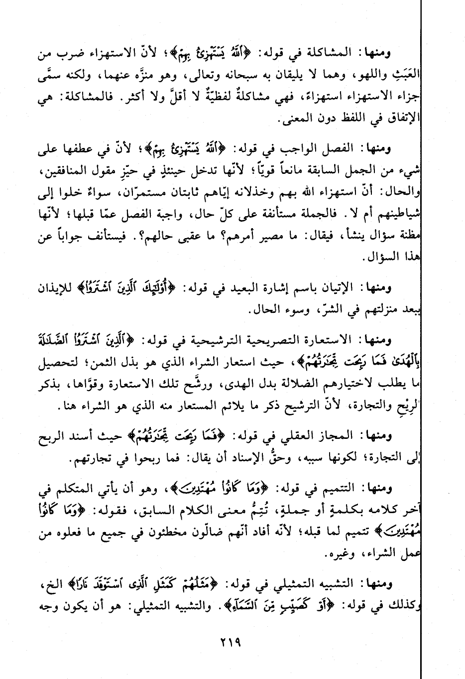 ومنها: المشاكلة في قوله: {اللَّهُ يَسْتَهْزِئُ بِهِمْ}؛ لأنّ الاستهزاء ضرب من العبث واللهو، وهما لا يليقان به سبحانه وتعالى، وهو منزّه عنهما، ولكنه سمّى جزاء الاستهزاء استهزاء، فهي مشاكلة لفظيّة لا أقلّ ولا أكثر. فالمشاكلة: هي الإتفاق في اللفظ دون المعنى.