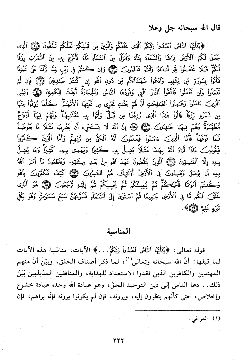 {يا أَيُّهَا النَّاسُ اعْبُدُوا رَبَّكُمُ الَّذِي خَلَقَكُمْ وَالَّذِينَ مِنْ قَبْلِكُمْ لَعَلَّكُمْ تَتَّقُونَ (21) الَّذِي جَعَلَ لَكُمُ الْأَرْضَ فِراشًا وَالسَّماءَ بِناءً وَأَنْزَلَ مِنَ السَّماءِ ماءً فَأَخْرَجَ بِهِ مِنَ الثَّمَراتِ رِزْقًا لَكُمْ فَلا تَجْعَلُوا لِلَّهِ أَنْدادًا وَأَنْتُمْ تَعْلَمُونَ (22) وَإِنْ كُنْتُمْ فِي رَيْبٍ مِمَّا نَزَّلْنا عَلى عَبْدِنا فَأْتُوا بِسُورَةٍ مِنْ مِثْلِهِ وَادْعُوا شُهَداءَكُمْ مِنْ دُونِ اللَّهِ إِنْ كُنْتُمْ صادِقِينَ (23) فَإِنْ لَمْ تَفْعَلُوا وَلَنْ تَفْعَلُوا فَاتَّقُوا النَّارَ الَّتِي وَقُودُهَا النَّاسُ وَالْحِجارَةُ أُعِدَّتْ لِلْكافِرِينَ (24) وَبَشِّرِ الَّذِينَ آمَنُوا وَعَمِلُوا الصَّالِحاتِ أَنَّ لَهُمْ جَنَّاتٍ تَجْرِي مِنْ تَحْتِهَا الْأَنْهارُ كُلَّما رُزِقُوا مِنْها مِنْ ثَمَرَةٍ رِزْقًا قالُوا هذَا الَّذِي رُزِقْنا مِنْ قَبْلُ وَأُتُوا بِهِ مُتَشابِهًا وَلَهُمْ فِيها أَزْواجٌ مُطَهَّرَةٌ وَهُمْ فِيها خالِدُونَ (25) إِنَّ اللَّهَ لا يَسْتَحْيِي أَنْ يَضْرِبَ مَثَلًا ما بَعُوضَةً فَما فَوْقَها فَأَمَّا الَّذِينَ آمَنُوا فَيَعْلَمُونَ أَنَّهُ الْحَقُّ مِنْ رَبِّهِمْ وَأَمَّا الَّذِينَ كَفَرُوا فَيَقُولُونَ ماذا أَرادَ اللَّهُ بِهذا مَثَلًا يُضِلُّ بِهِ كَثِيرًا وَيَهْدِي بِهِ كَثِيرًا وَما يُضِلُّ بِهِ إِلاَّ الْفاسِقِينَ (26) الَّذِينَ يَنْقُضُونَ عَهْدَ اللَّهِ مِنْ بَعْدِ مِيثاقِهِ وَيَقْطَعُونَ ما أَمَرَ اللَّهُ بِهِ أَنْ يُوصَلَ وَيُفْسِدُونَ فِي الْأَرْضِ أُولئِكَ هُمُ الْخاسِرُونَ (27) كَيْفَ تَكْفُرُونَ بِاللَّهِ وَكُنْتُمْ أَمْواتًا فَأَحْياكُمْ ثُمَّ يُمِيتُكُمْ ثُمَّ يُحْيِيكُمْ ثُمَّ إِلَيْهِ تُرْجَعُونَ (28) هُوَ الَّذِي خَلَقَ لَكُمْ ما فِي الْأَرْضِ جَمِيعًا ثُمَّ اسْتَوى إِلَى السَّماءِ فَسَوَّاهُنَّ سَبْعَ سَماواتٍ وَهُوَ بِكُلِّ شَيْءٍ عَلِيمٌ (29)}.