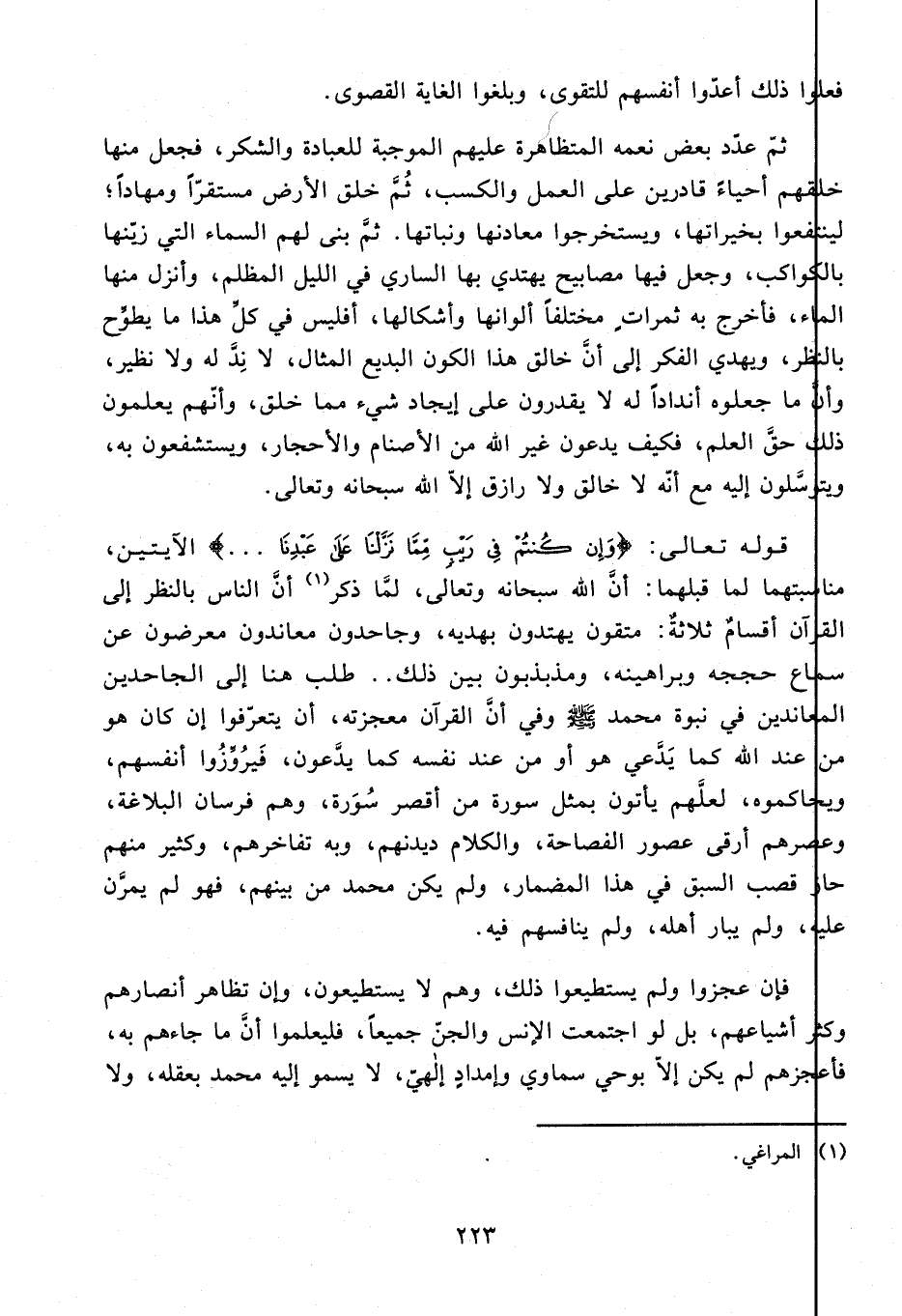 قوله تعالى: {وَإِنْ كُنْتُمْ فِي رَيْبٍ مِمَّا نَزَّلْنا عَلى عَبْدِنا ...} الآيتين، مناسبتهما لما قبلهما: أنّ الله سبحانه وتعالى، لمّا ذكر (¬1) أنّ الناس بالنظر إلى القرآن أقسام ثلاثة: متقون يهتدون بهديه، وجاحدون معاندون معرضون عن سماع حججه وبراهينه، ومذبذبون بين ذلك .. طلب هنا إلى الجاحدين المعاندين في نبوة محمد صلّى الله عليه وسلّم وفي أنّ القرآن معجزته، أن يتعرّفوا إن كان هو من عند الله كما يدّعي هو أو من عند نفسه كما يدّعون، فيروّزوا أنفسهم، ويحاكموه، لعلّهم يأتون بمثل سورة من أقصر سورة، وهم فرسان البلاغة، وعصرهم أرقى عصور الفصاحة، والكلام ديدنهم، وبه تفاخرهم، وكثير منهم حاز قصب السبق في هذا المضمار، ولم يكن محمد من بينهم، فهو لم يمرّن عليه، ولم يبار أهله، ولم ينافسهم فيه.